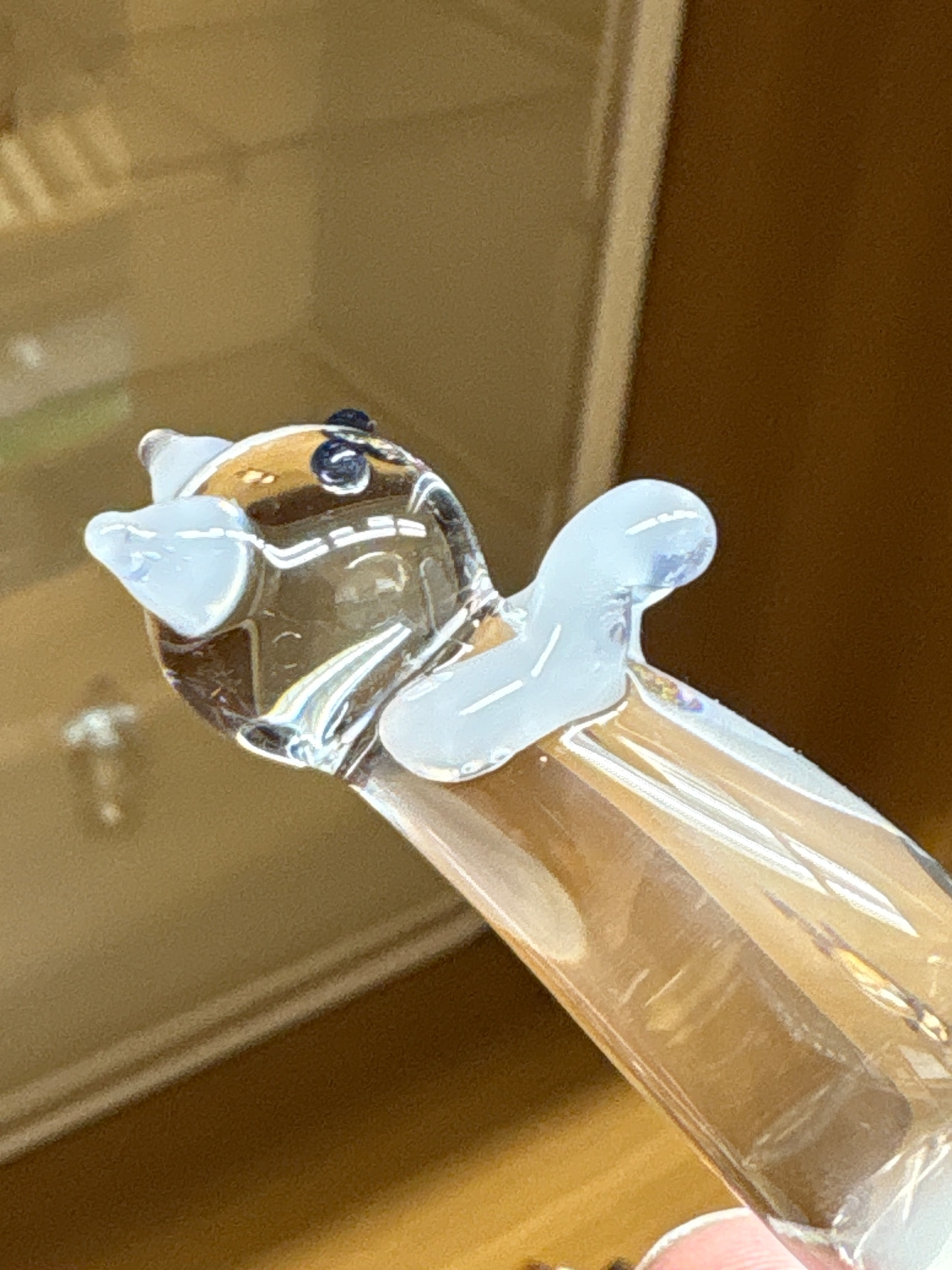 This variation is crafted in clear glass with subtle white accents, and light brown coloring on the ears and paws, giving it a delicate and translucent appearance.
