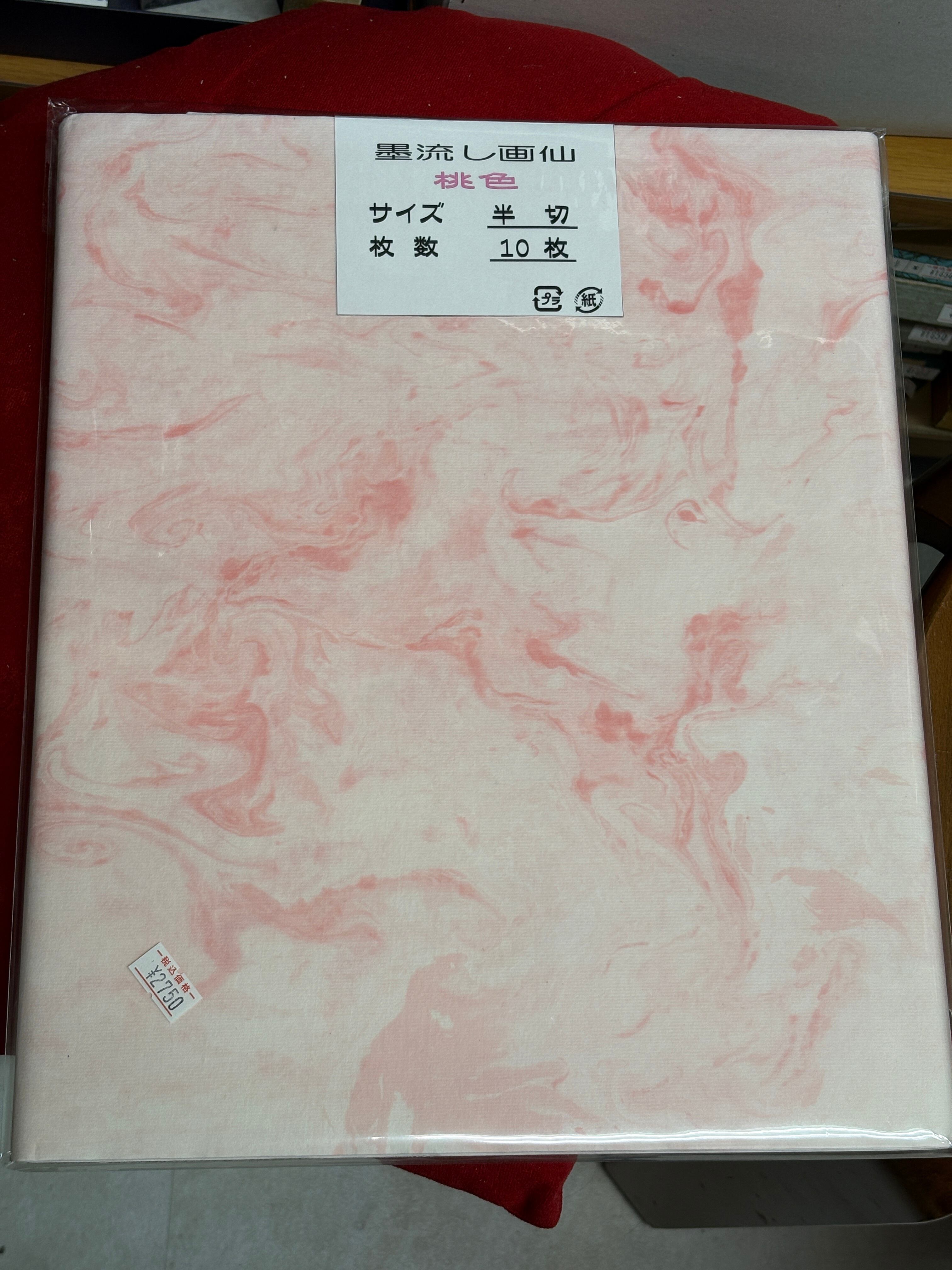 ピンク色の墨流し模様が入った画仙紙で漢字や近代詩文用で半切サイズの手漉き画仙紙になります。