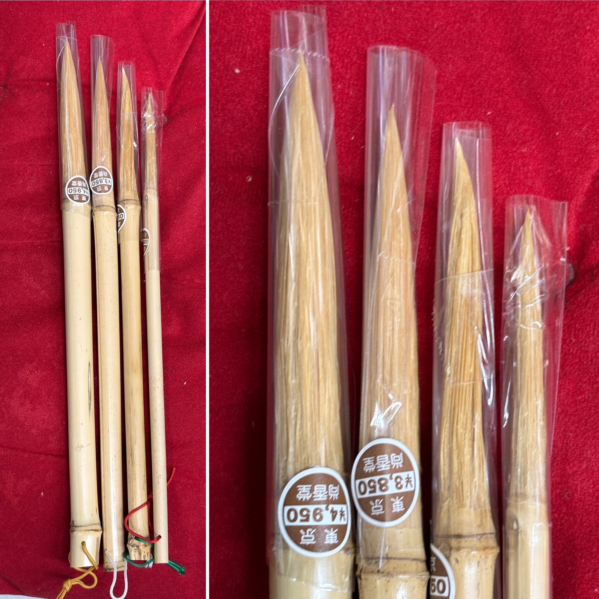 The official bristle length is listed as 10 cm, but this includes the portion up to the bamboo node. The actual usable length is somewhat shorter. (For reference, the brush is the second from the left in the second photo.)