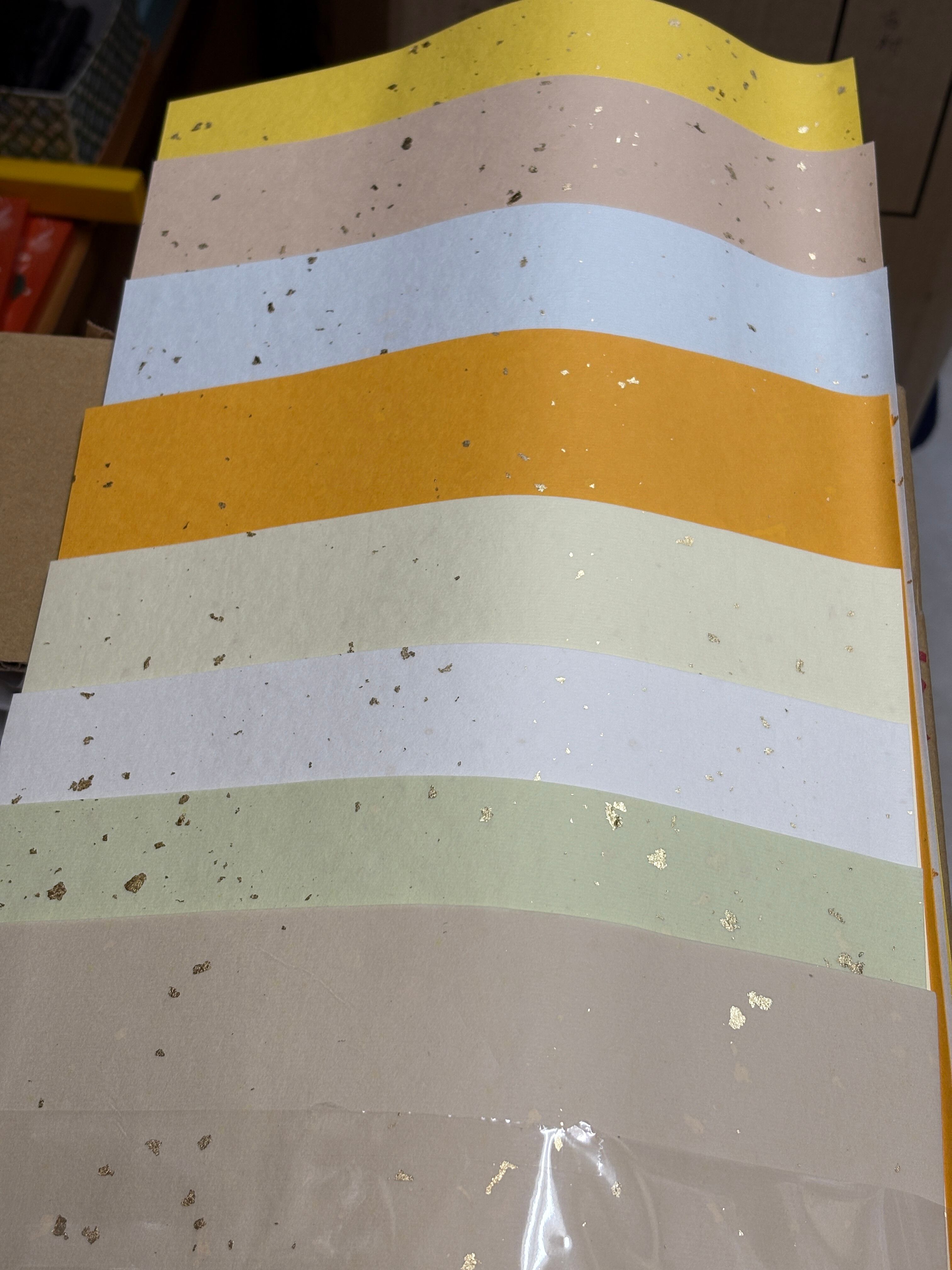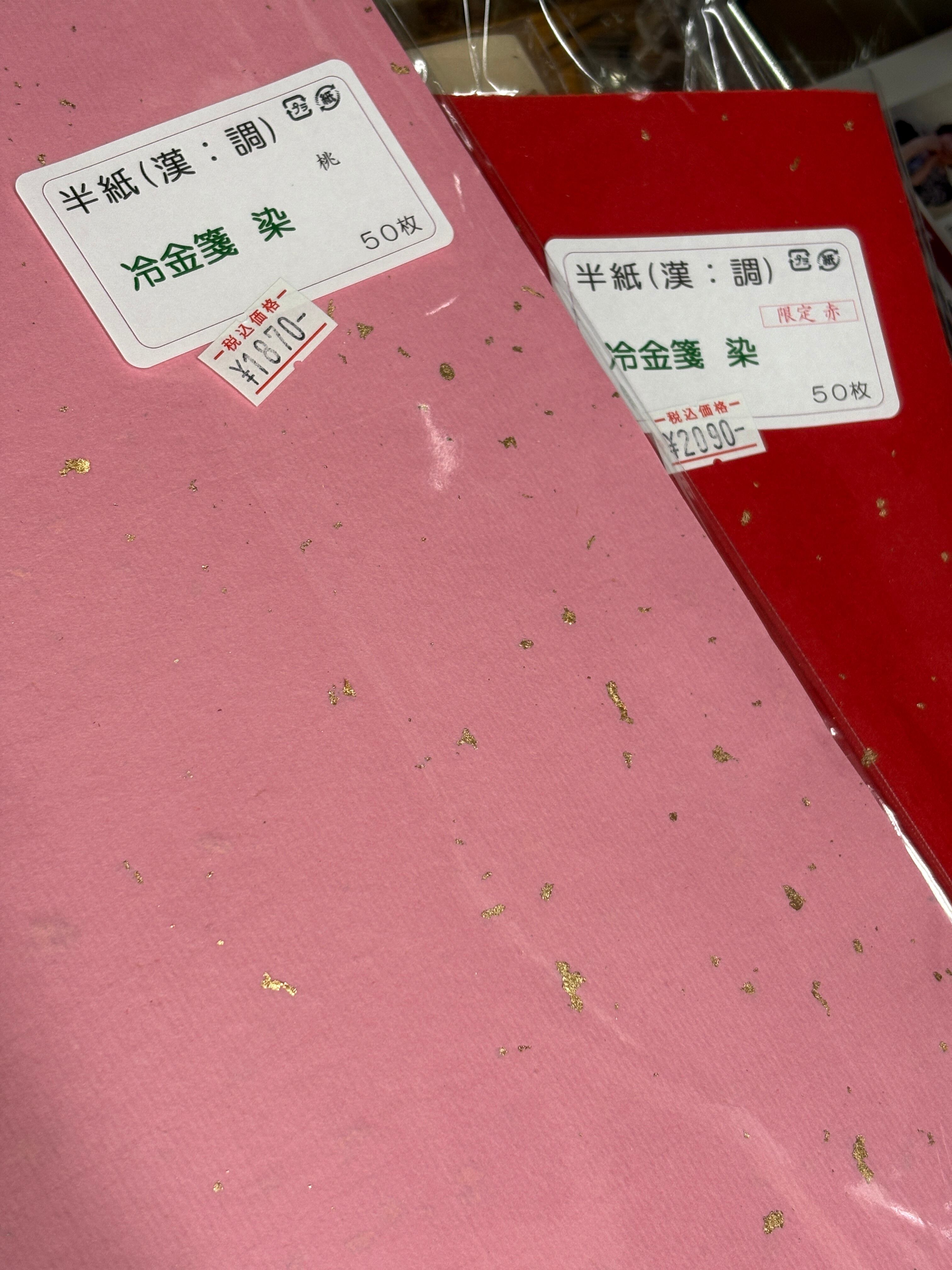 以前の八色(ハチショク)冷金箋の半紙判に赤、ピンクの2色を足して、水色、黄色、白、ウグイス、ベージュ、うす黄、オレンジ、薄茶、赤、ピンクの冷金箋が10枚ずつ入っています。