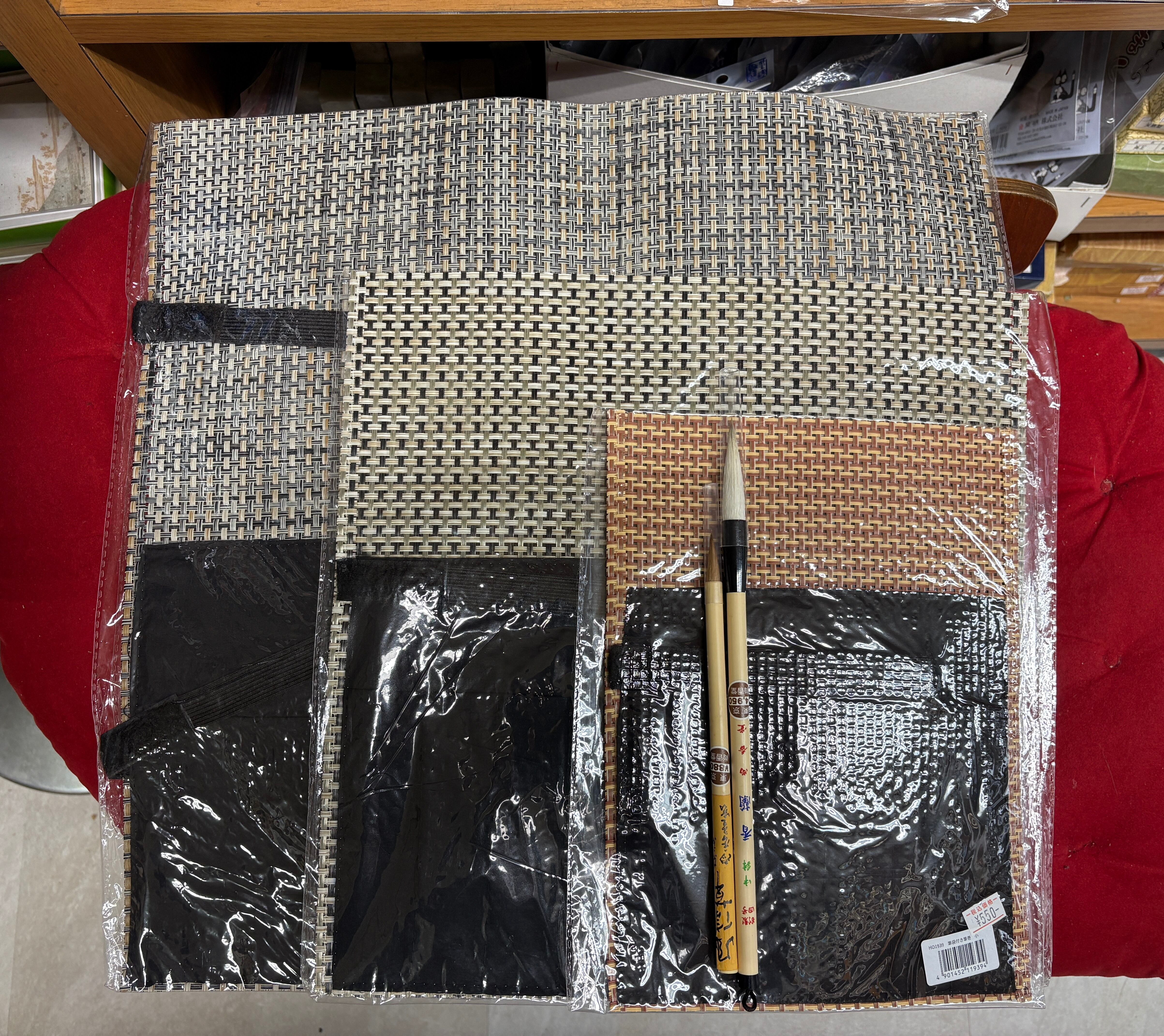 ビニール地でメッシュ織りになっており、竹素材とは異なり汚れをふき取りやすい素材になっております。また筆の穂先を守るだけでなく、通気性があるため毛や軸の腐敗を防ぎます。布の部分がポケットになっており、筆を分けて綺麗に収納できる便利な筆巻です。