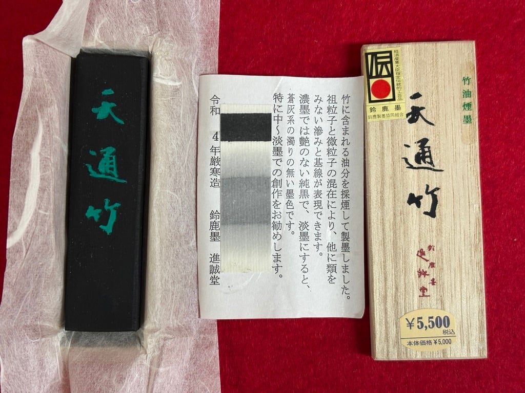 This 1-chō size ink stick is made from soot extracted from bamboo oil, kneaded with water buffalo glue.