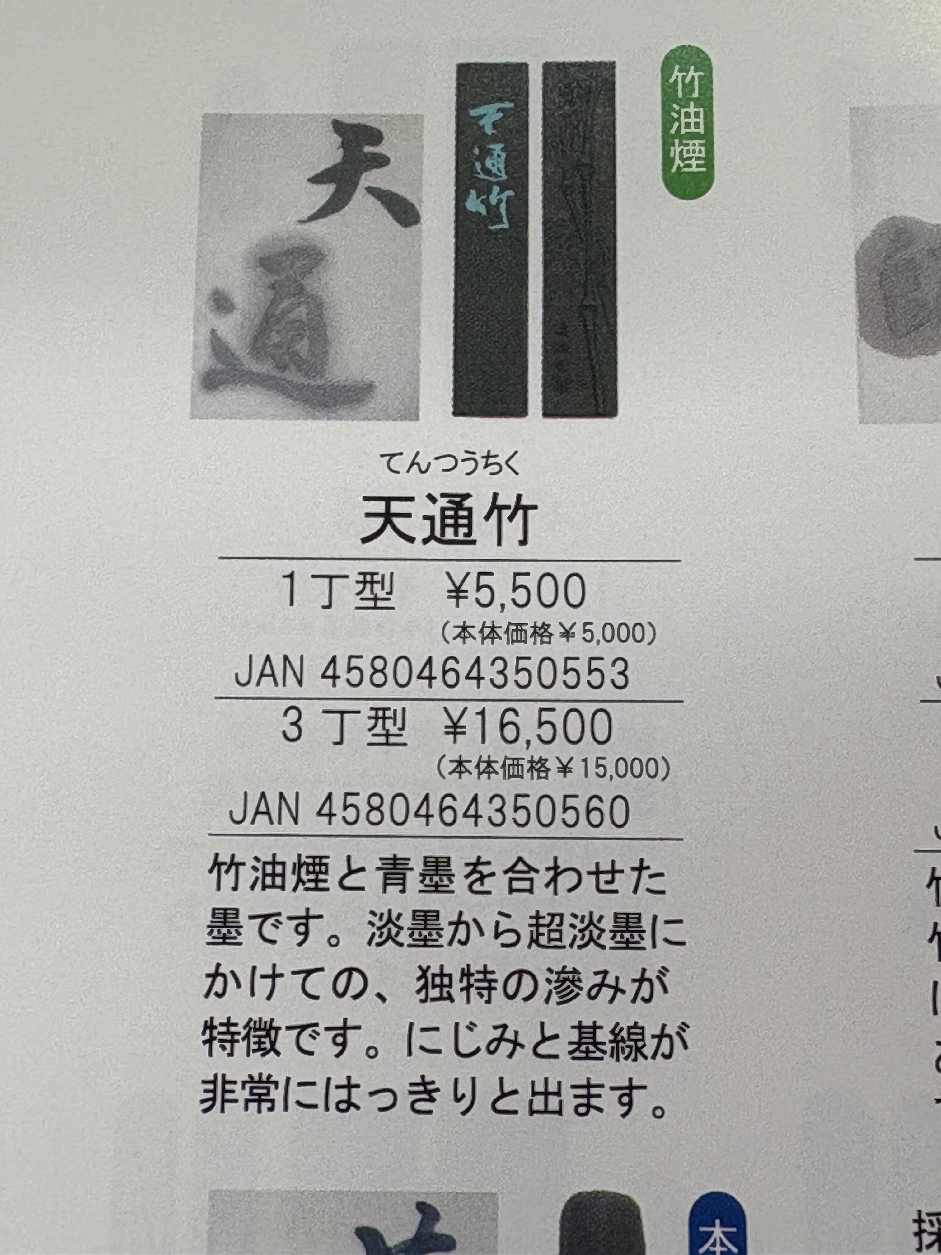 独特の滲みが特徴的な竹油煙墨『天通竹』一丁型 “Tentsūchiku” – Bamboo Oil Soot Ink Stick with Unique Bleed Effect (1-Chō Size)