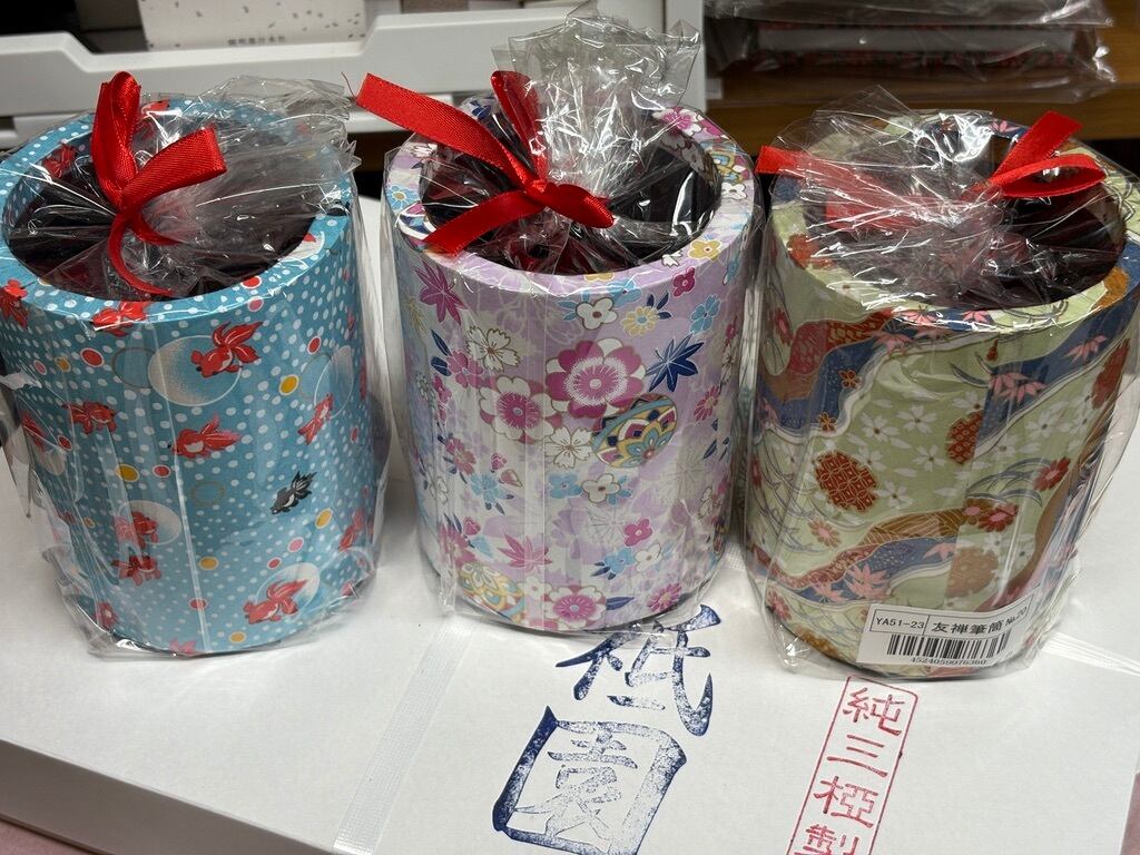 千代紙で巻かれた筆筒になります。9㎝直径×11.6㎝高さ