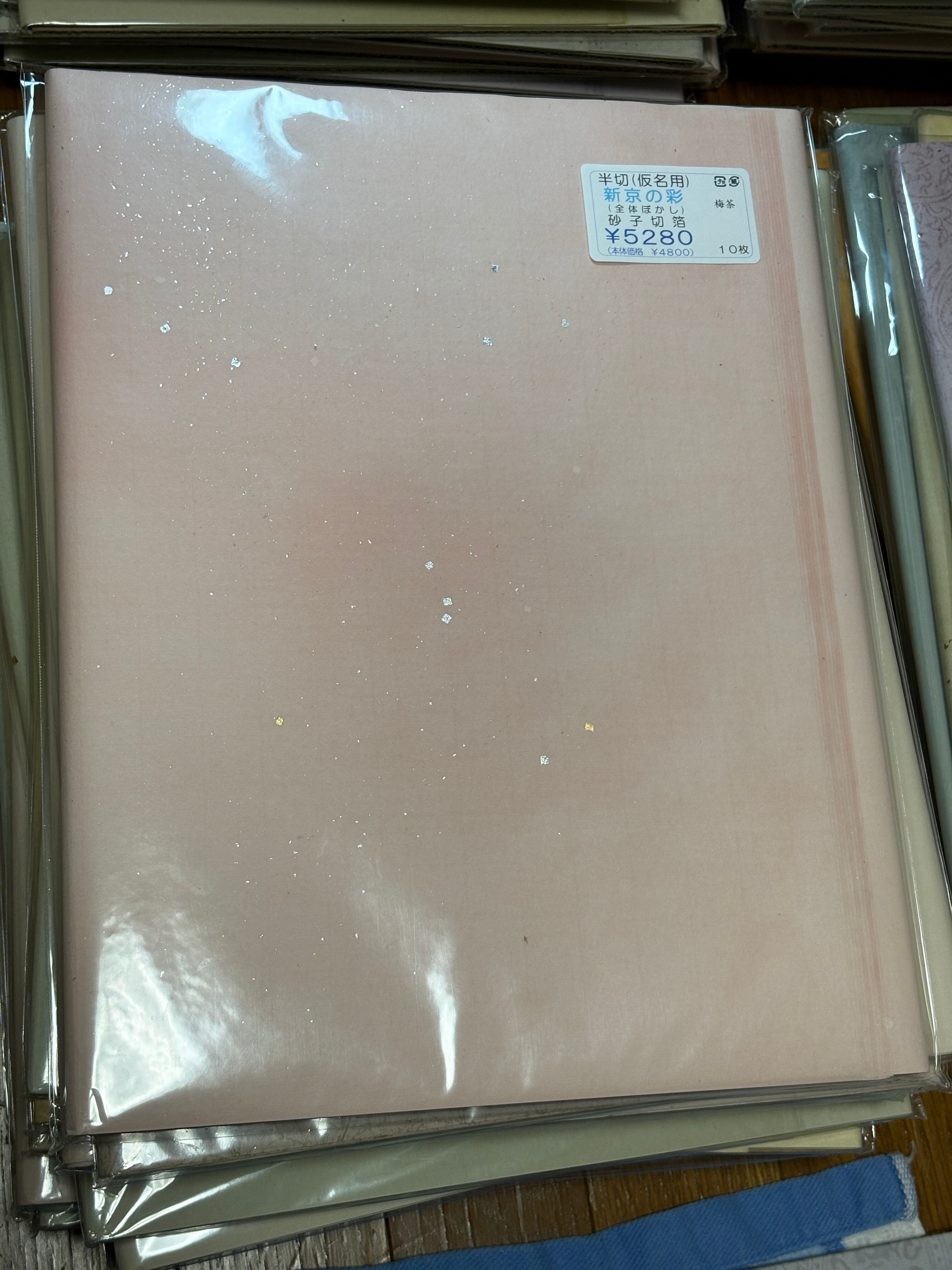 柄は色が梅茶という落ち着いた感じのピンク色が全体ぼかしで入っています。砂子や切箔も鮮やかな料紙になっております。