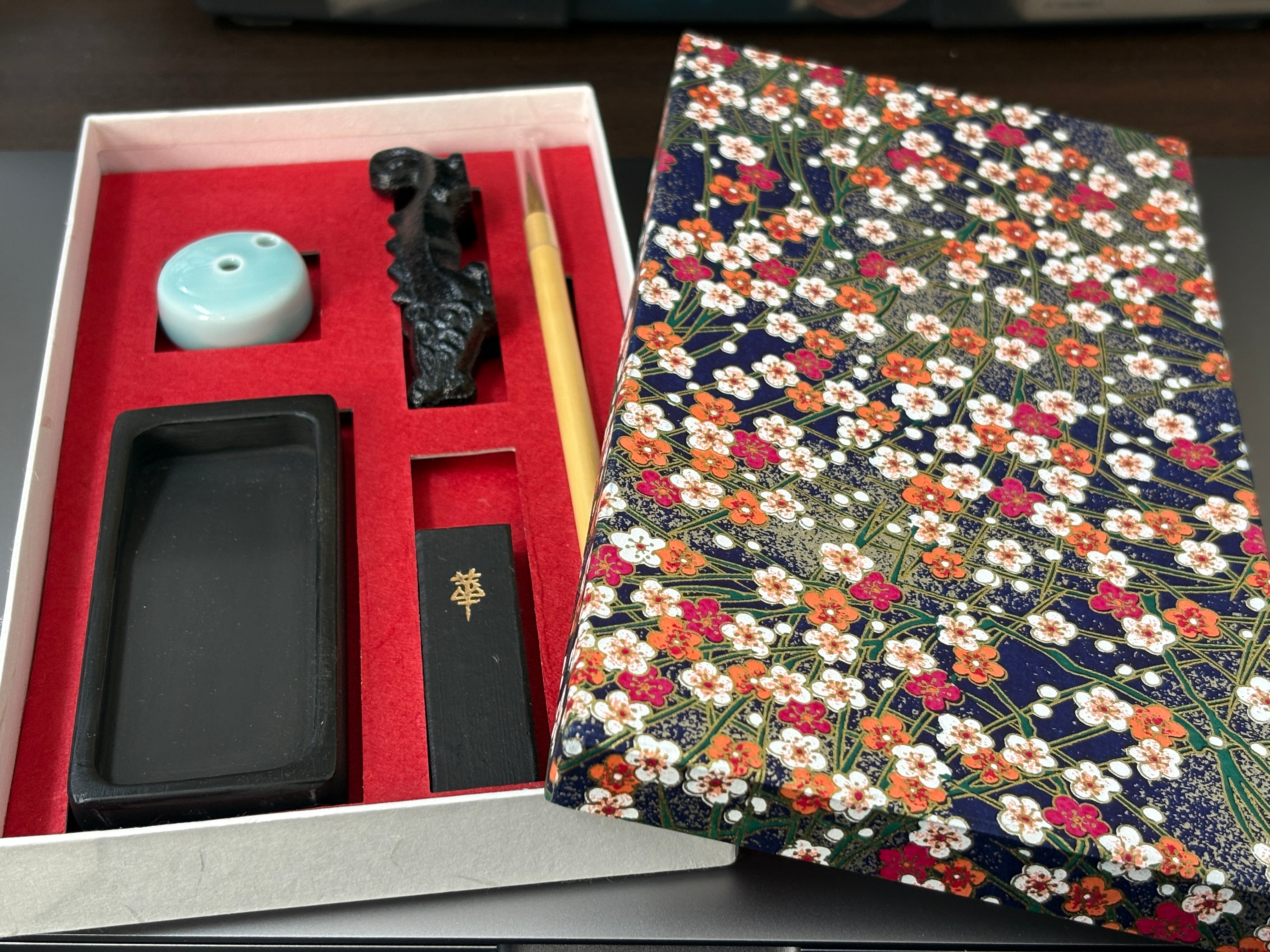 友禅箱入りの簡易書道セットに半紙の半分の半分サイズの『半々半紙』(当店オリジナル柄)が