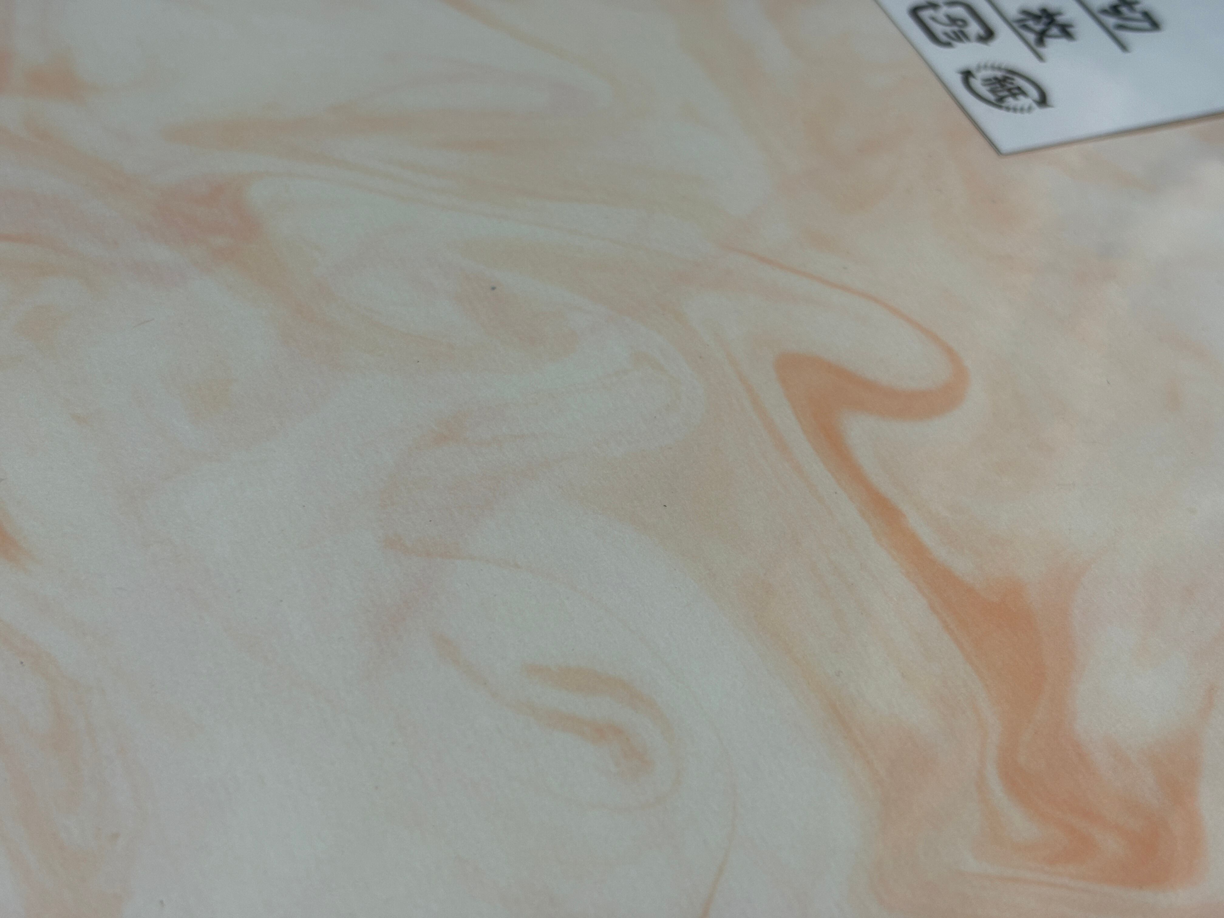 オレンジ色の墨流し模様が入った画仙紙で漢字や近代詩文用に墨の入る紙になってまして、半切サイズ(35×136cm)の手漉き書道紙10枚入りになります。