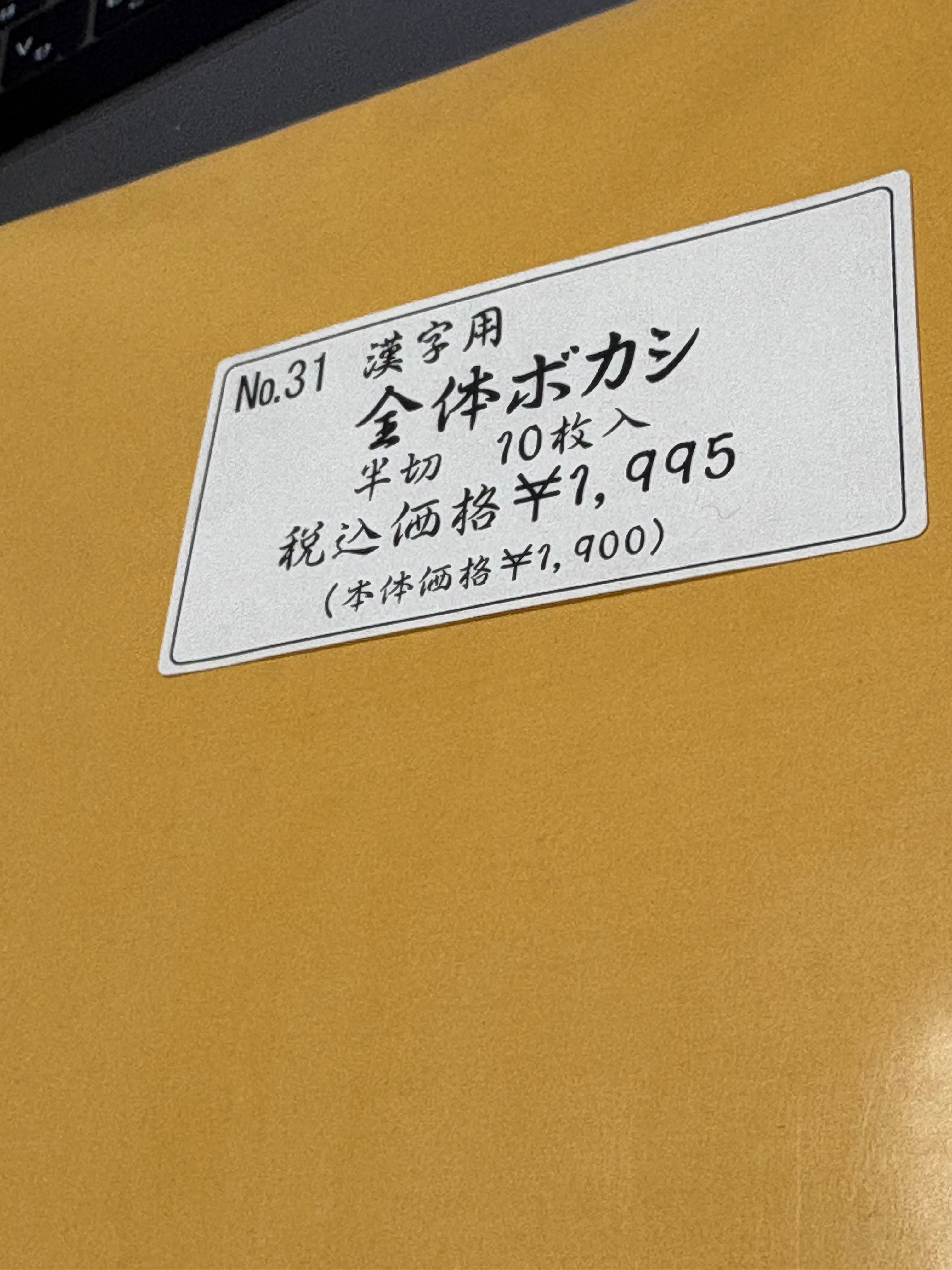 かな用ではよくあるんですが、漢字用では珍しい全体的に色ボカシが入った染め紙・加工紙になります。こちらはオレンジ色で半切サイズ(35×136cm)の手漉き書道紙10枚入りになります。染め紙になりますと多少滲みが止まりますので近代詩文・調和体にもお使いできます。消費税が変わる前の古い紙ですので処分特価になります。
