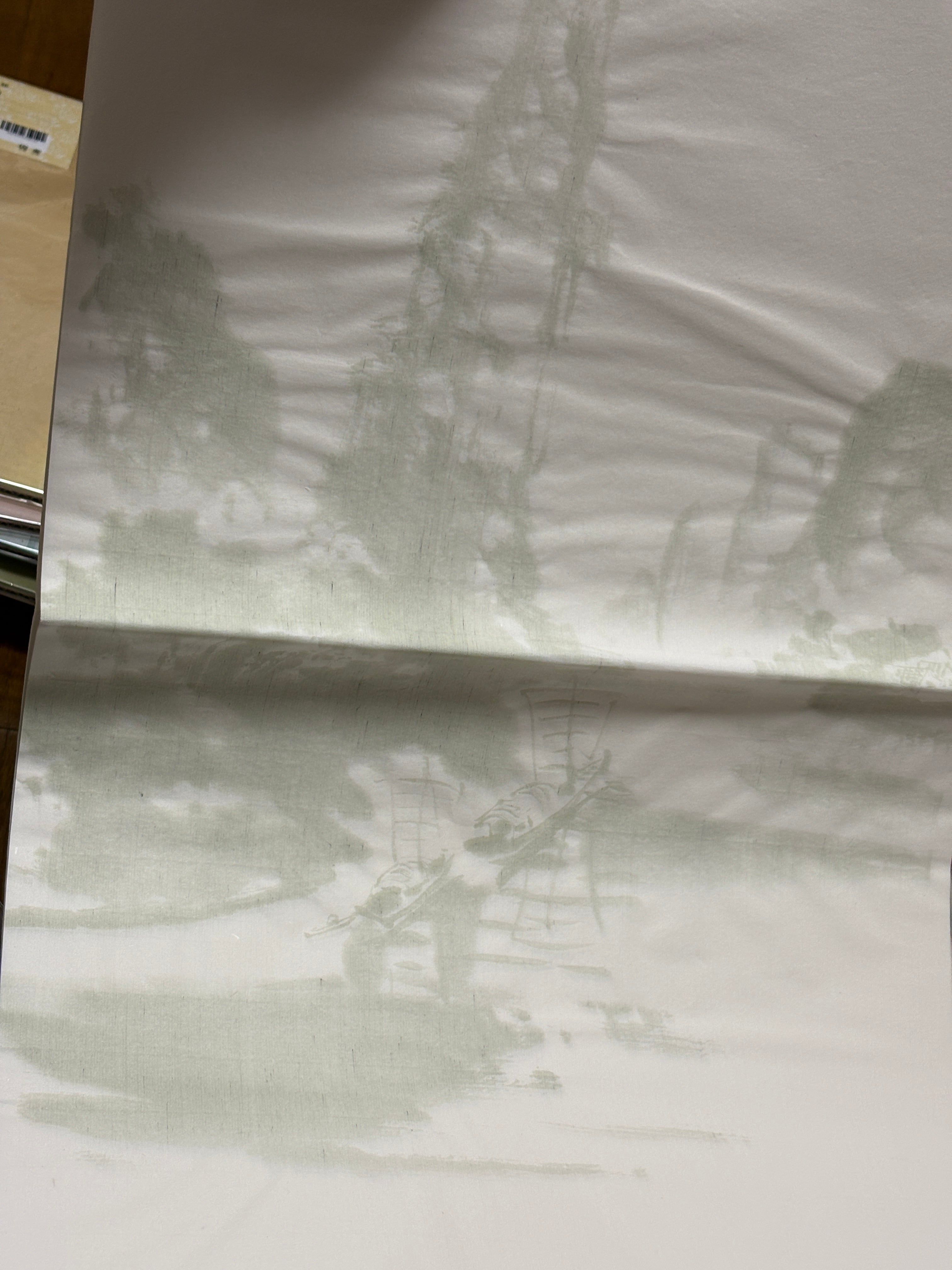 白色の紙に草色の山水図が施された漢字用加工紙になります。
