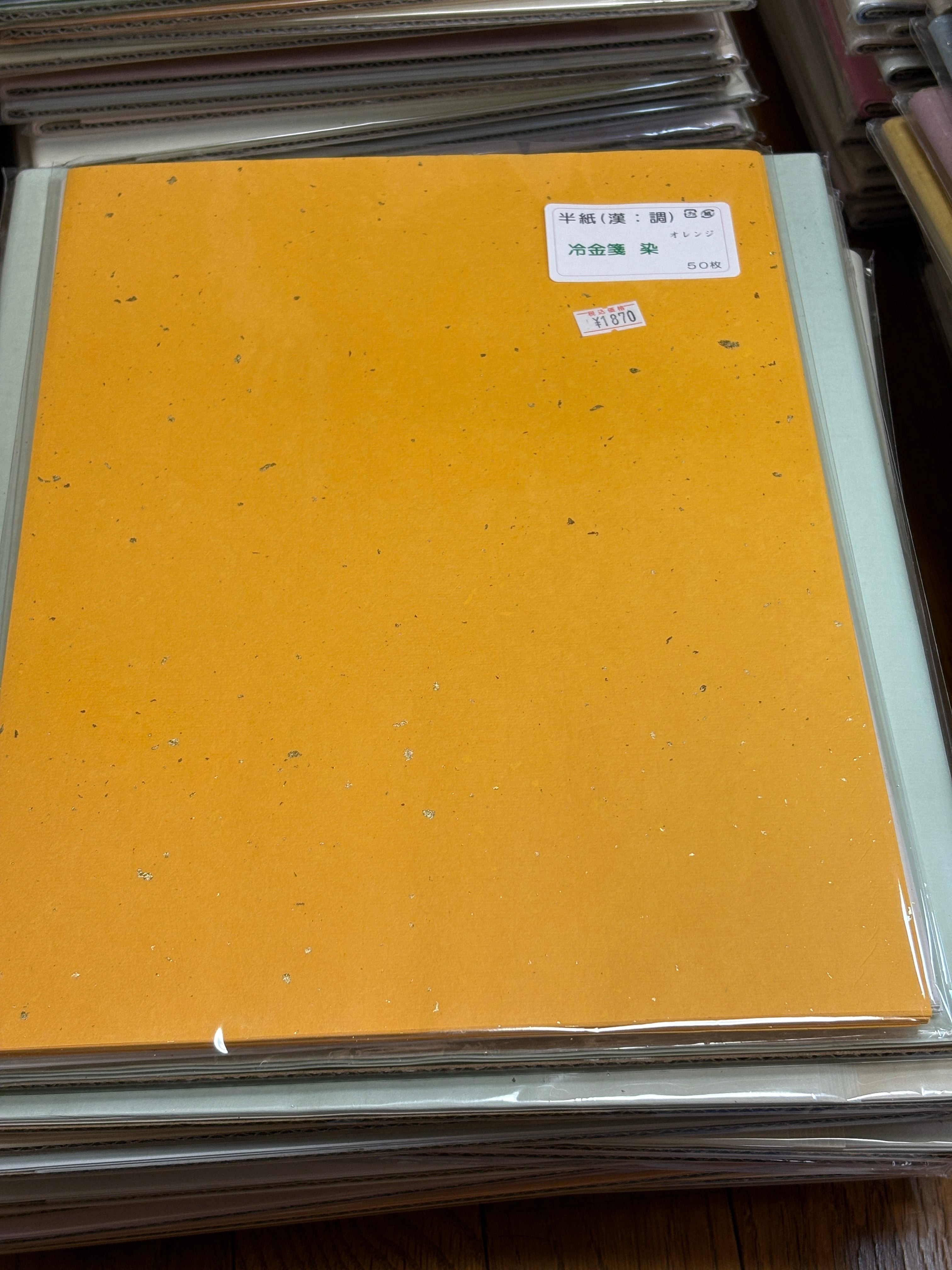 半紙サイズの金砂子が入った手漉き和紙のオレンジ色で50枚入りです。枚数にお気をつけください。