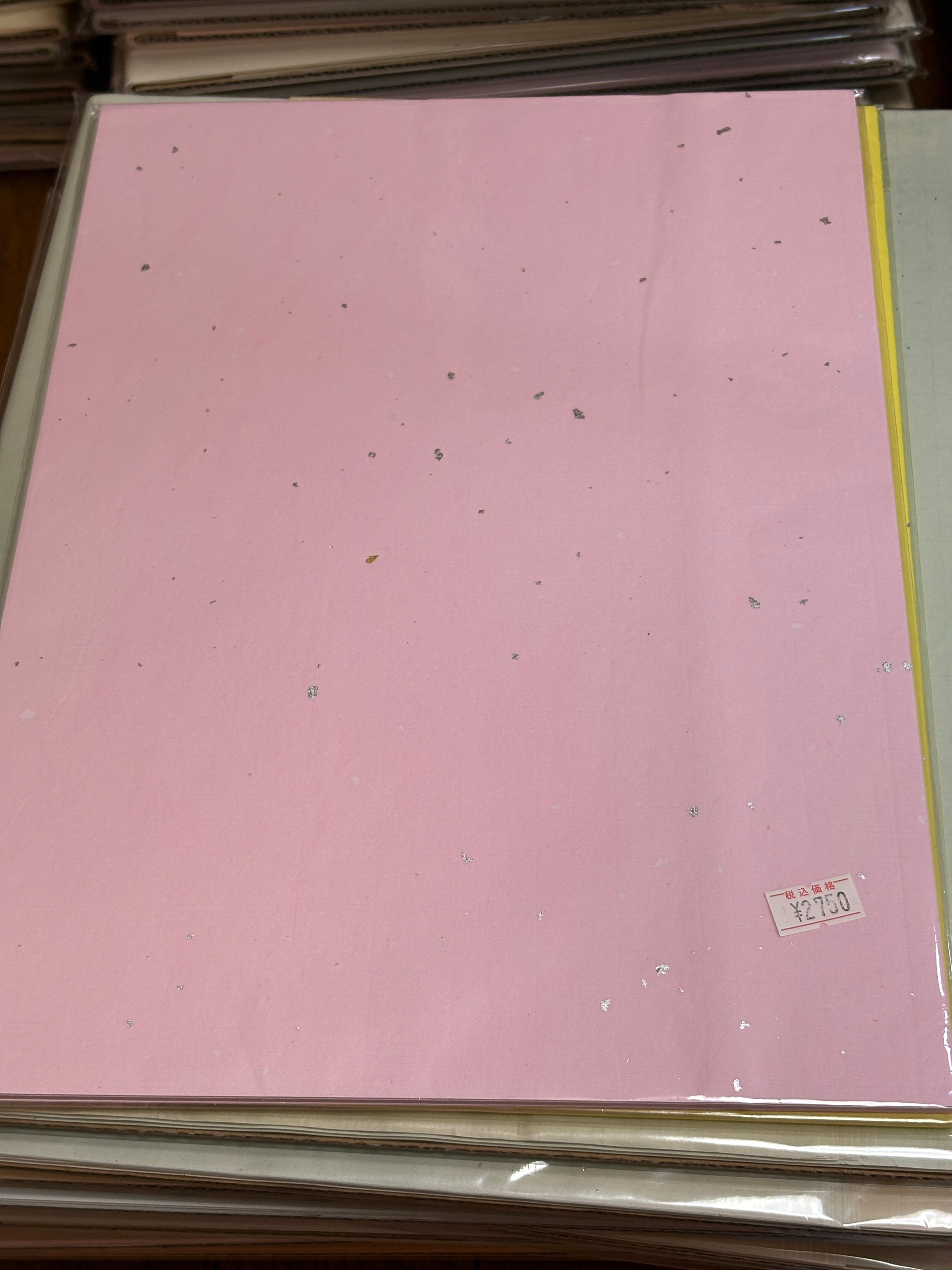 金砂子が入った冷金箋ではなく酒銀ふりと言われる銀が振ってある冷銀箋で半紙サイズの手漉き和紙、ピンク色で50枚入りです。