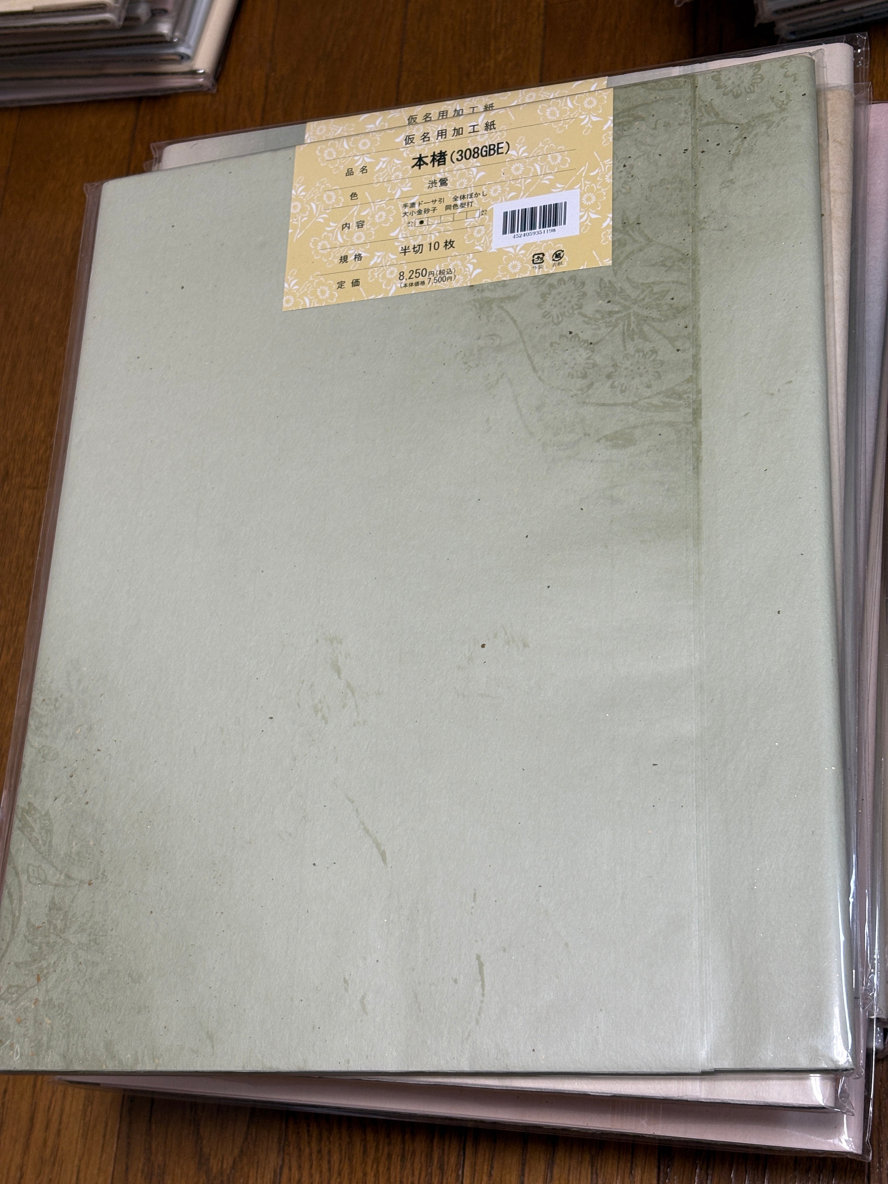 京都で加工された料紙でドーサ引(強めな加工)なので滲みはほぼなく、落ち着いた緑色である渋鶯系の全体ぼかしの中に大小金砂子があり、さらに同色系の型打ちがあり鮮やかな柄になっています。3枚目は古代紫色の画仙紙ですがわかりやすいように開いた写真を入れています。