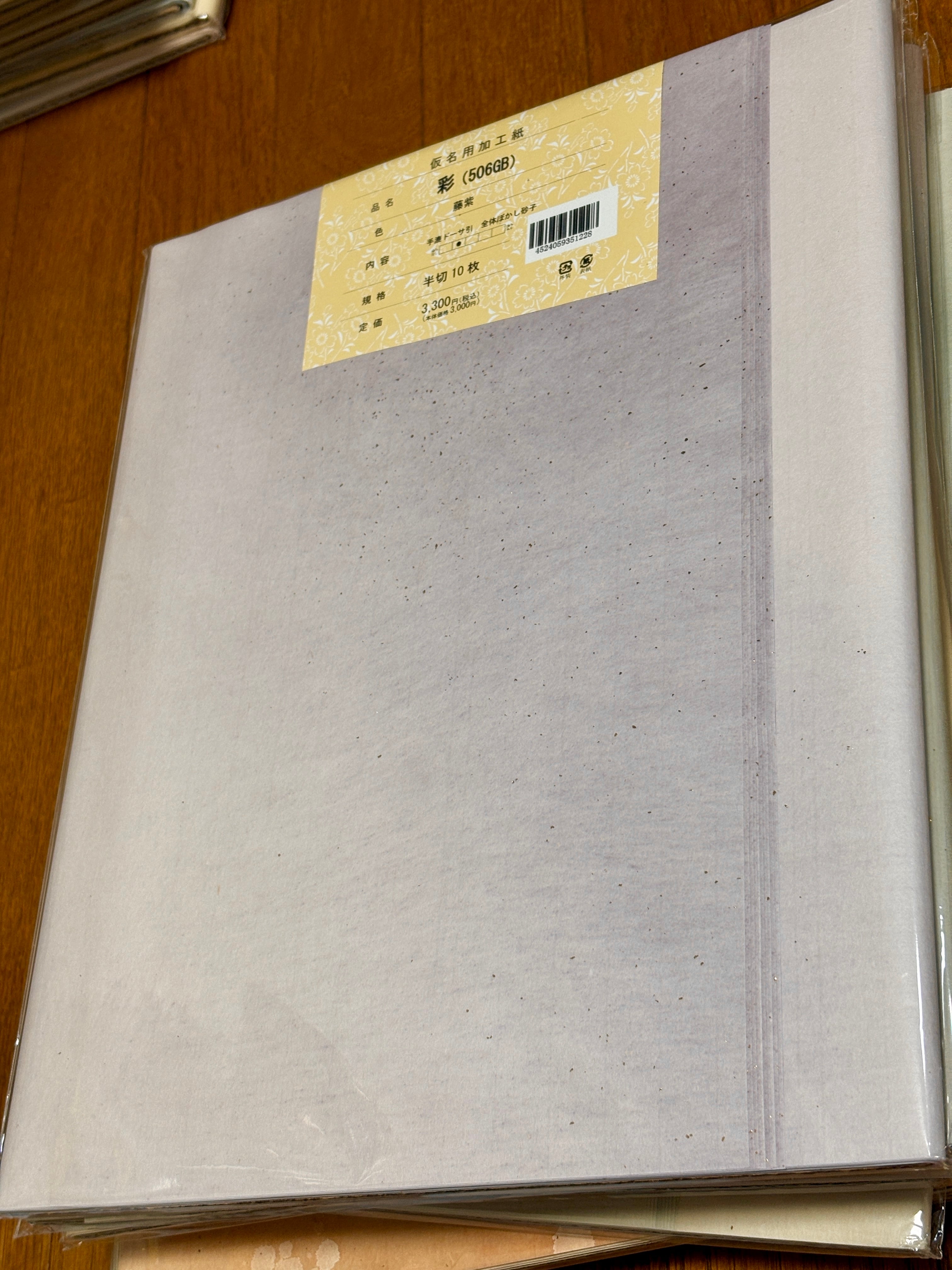 京都で加工された料紙でドーサ引(強めな加工)ですが滲みは少なめ程度で、全体ぼかしに砂子が入ったシンプルな組み合わせでベースの色が藤紫(落ち着いた紫)になります。
