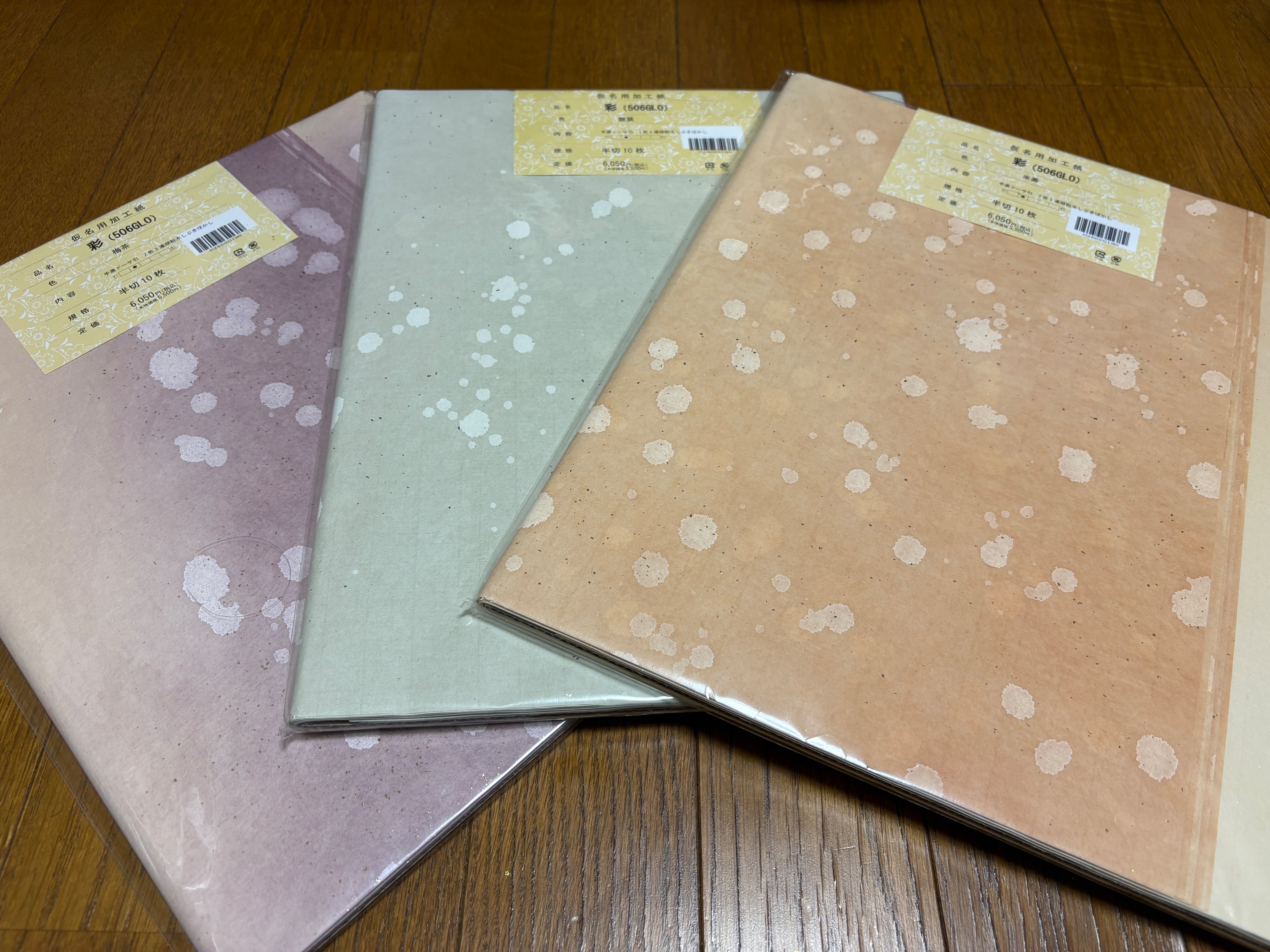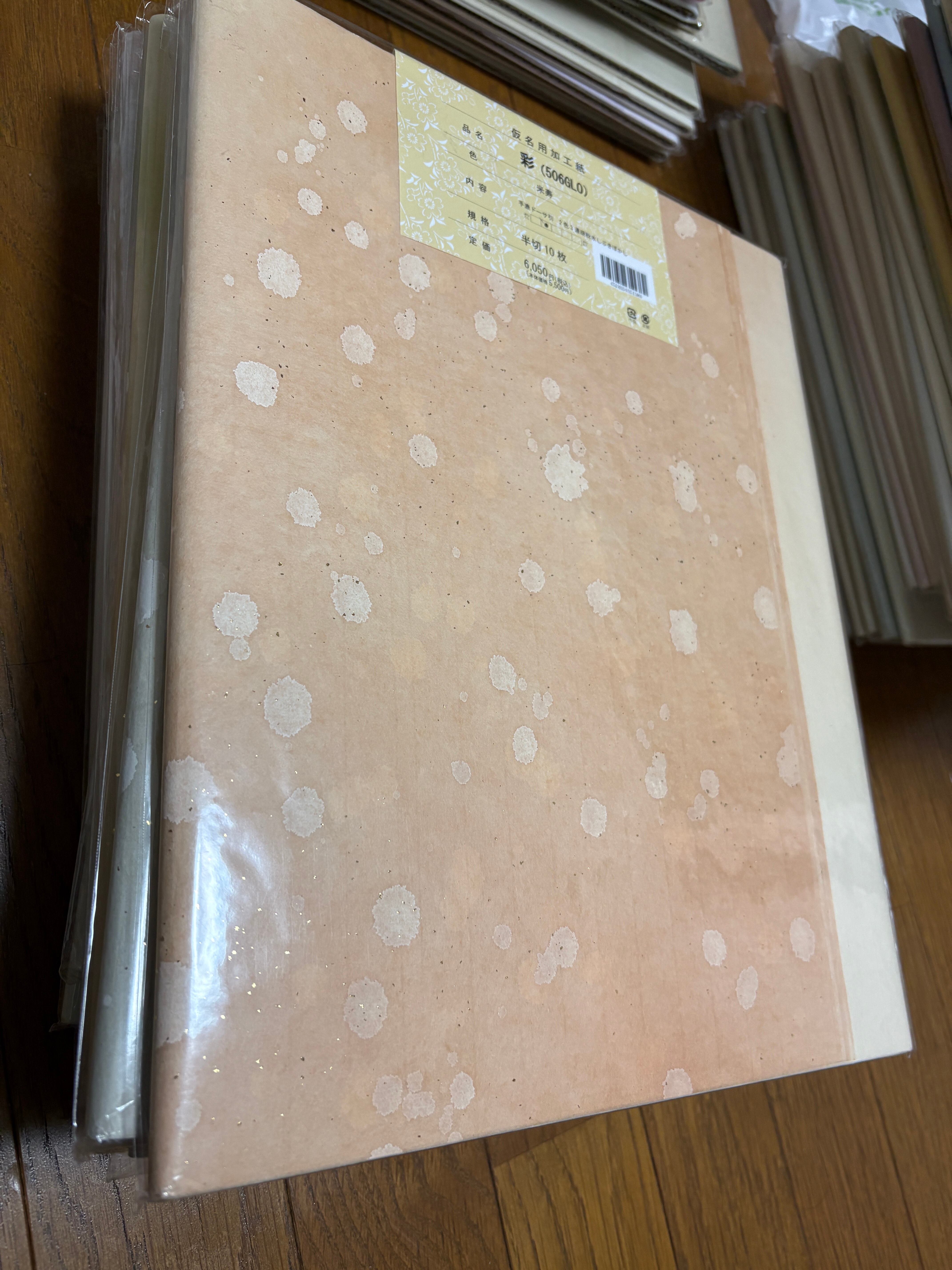 京都で加工された料紙でドーサ引(強めな加工)ですが滲みは少なめ程度で、全体ぼかしに砂子が入ったシンプルな組み合わせでベースの米寿(明るめの茶色系)に3箇所、胡粉で水しぶき状の模様をつけています。