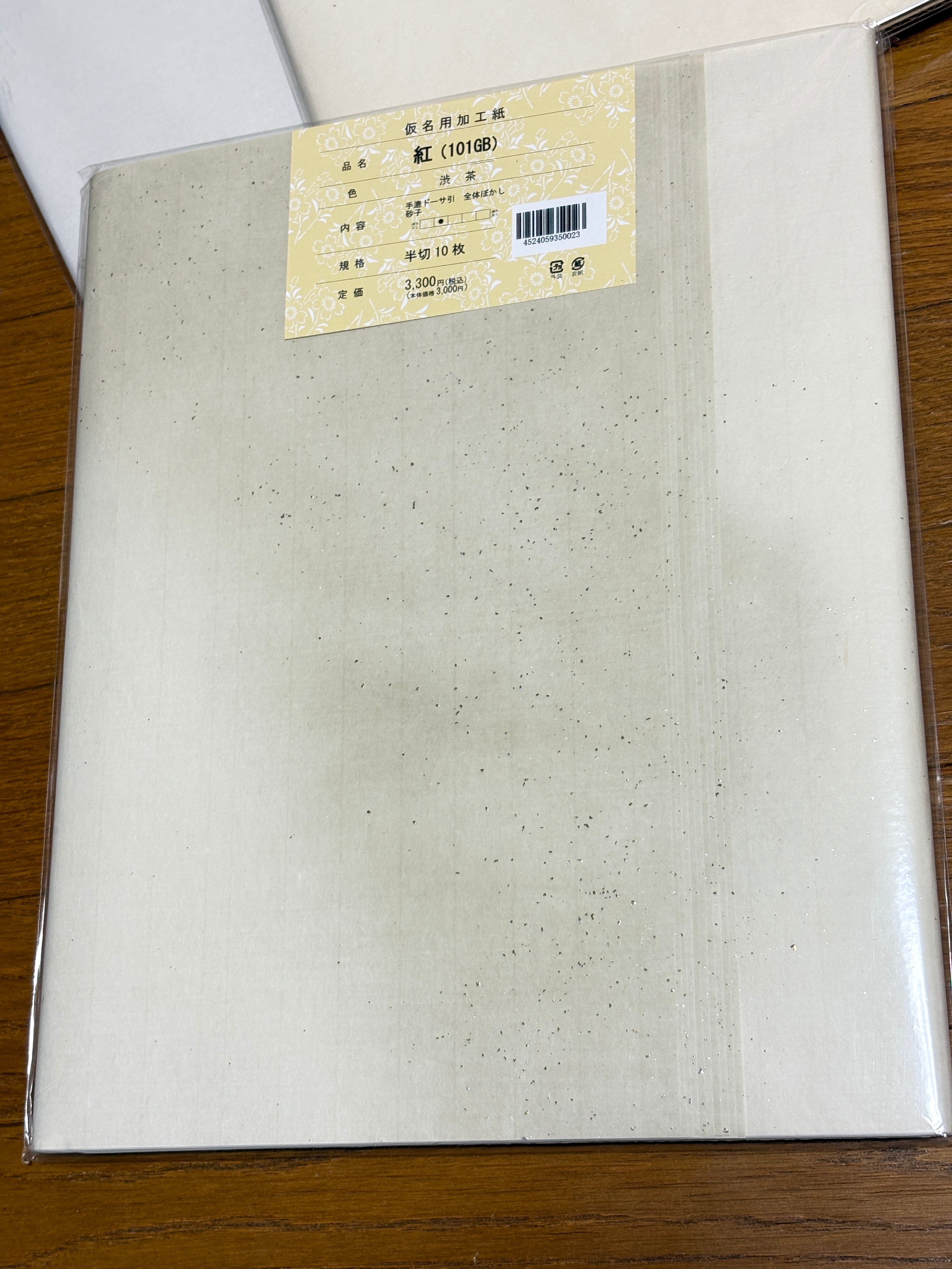 京都で加工された料紙でドーサ引(強めな加工)ですが滲みは少なめ程度で、全体ぼかしに砂子が入ったシンプルな組み合わせでベースの色が茶色より落ち着いた色になります。似た紙の彩シリーズよりは表面が滑らかで書きやすくなっているのが特徴です。