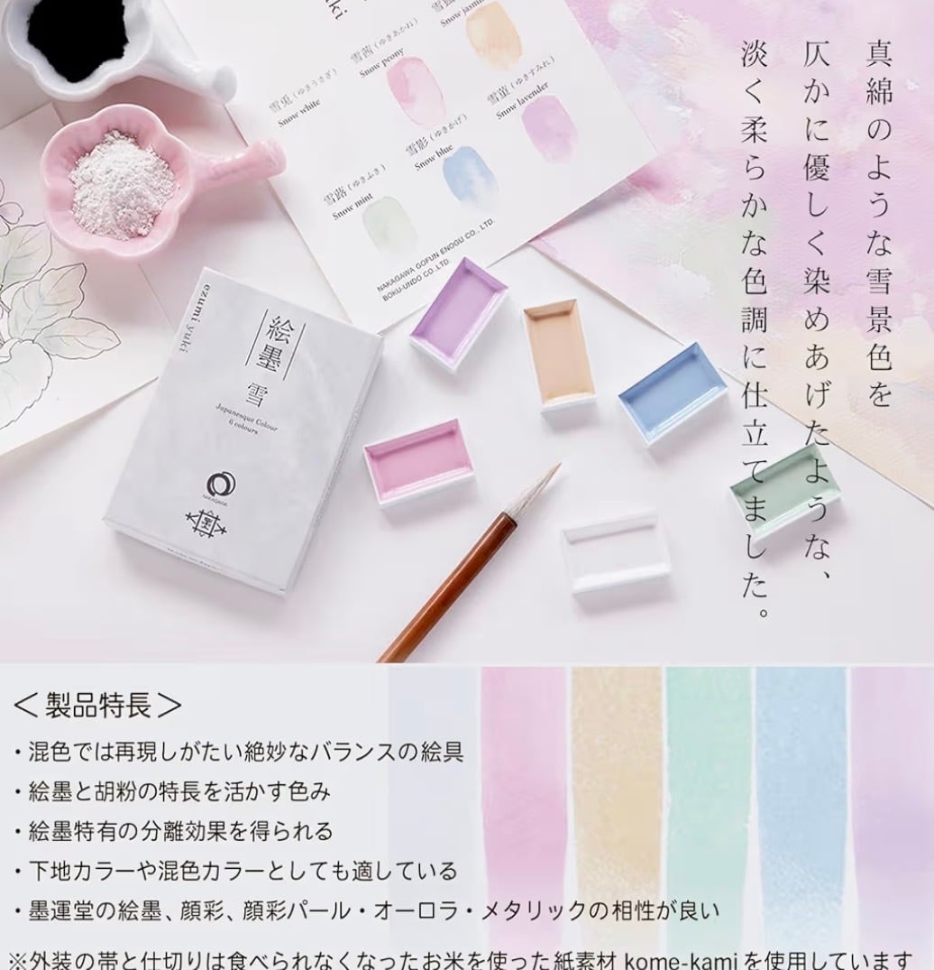 「絵墨雪」は胡粉や岩絵具を製造するナカガワ胡粉絵具株式会社と、墨を製造する株式会社墨運堂の共同企画商品です。白を極める企業と黒を極める企業の異色のコラボレーションにより商品化が実現しました。