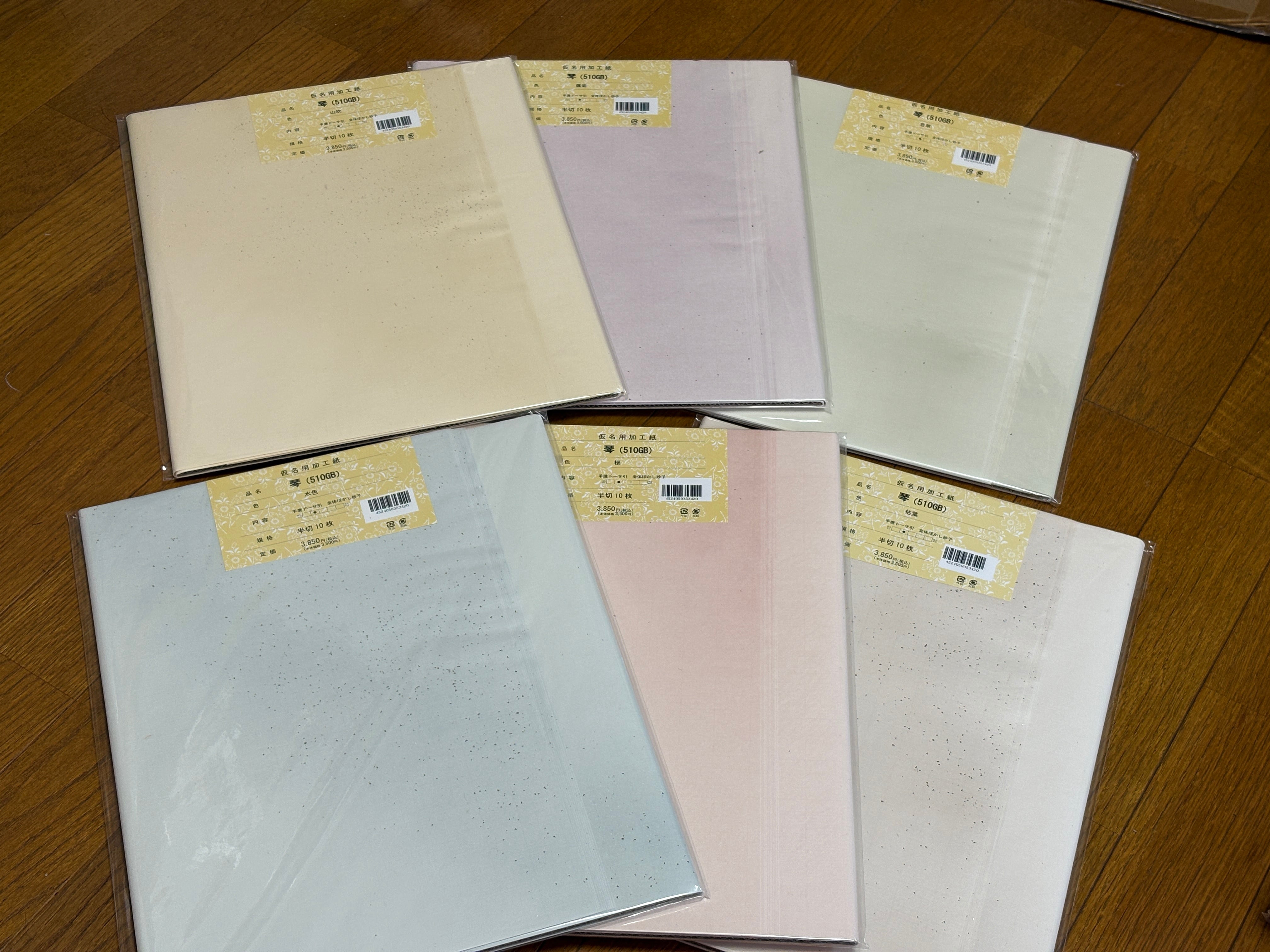 国内で加工された料紙でドーサ引(強めな加工)ですが滲みはかな用の割には少なめ程度(滲みを5段階にすると②程度)で、全体ぼかしに砂子が入ったシンプルな組み合わせでお求めやすい価格になります。