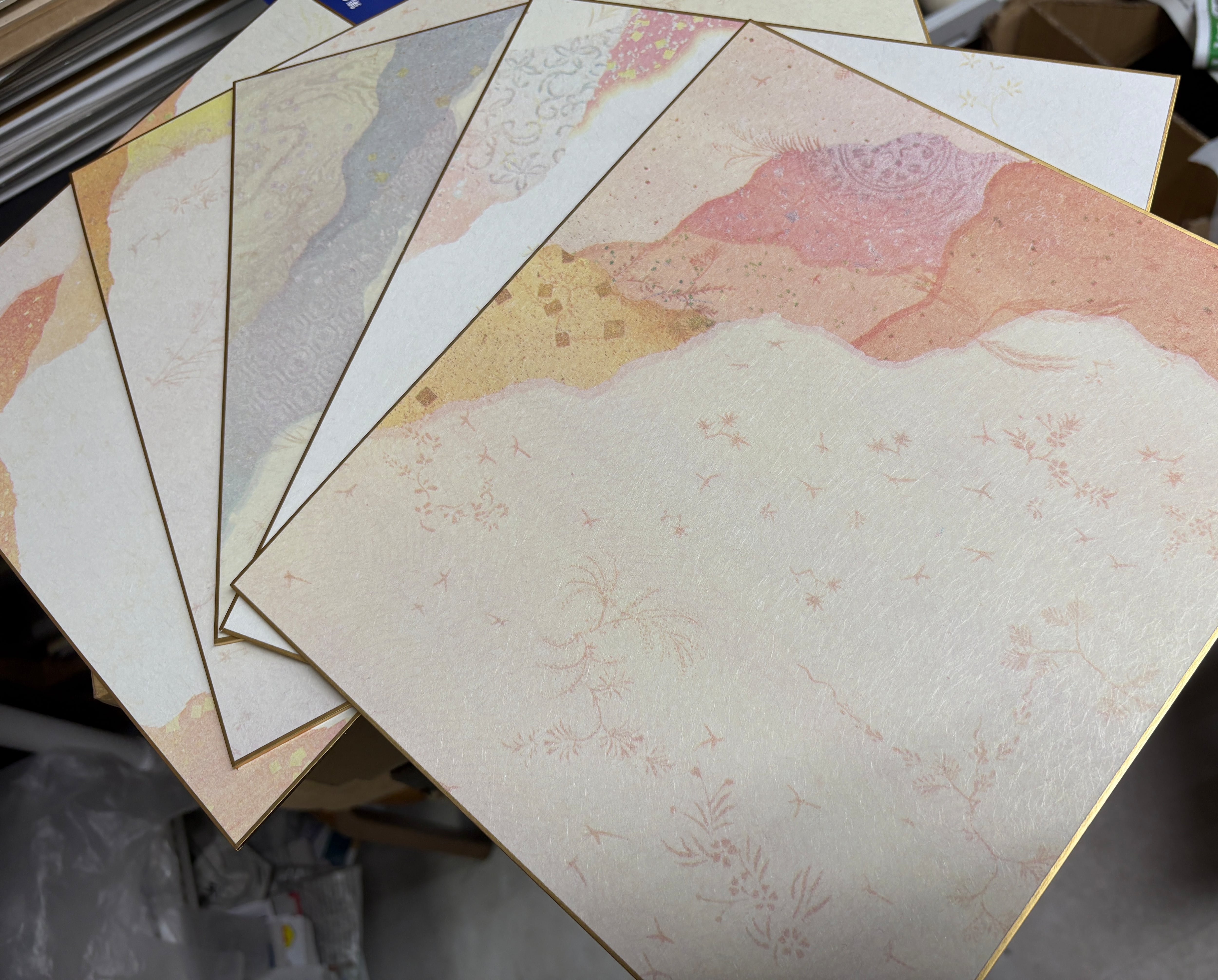 大色紙サイズ(24.2×27.3cm/一般的なサイン色紙と同サイズです)で5種類の切り継ぎ柄が入った色紙になります。