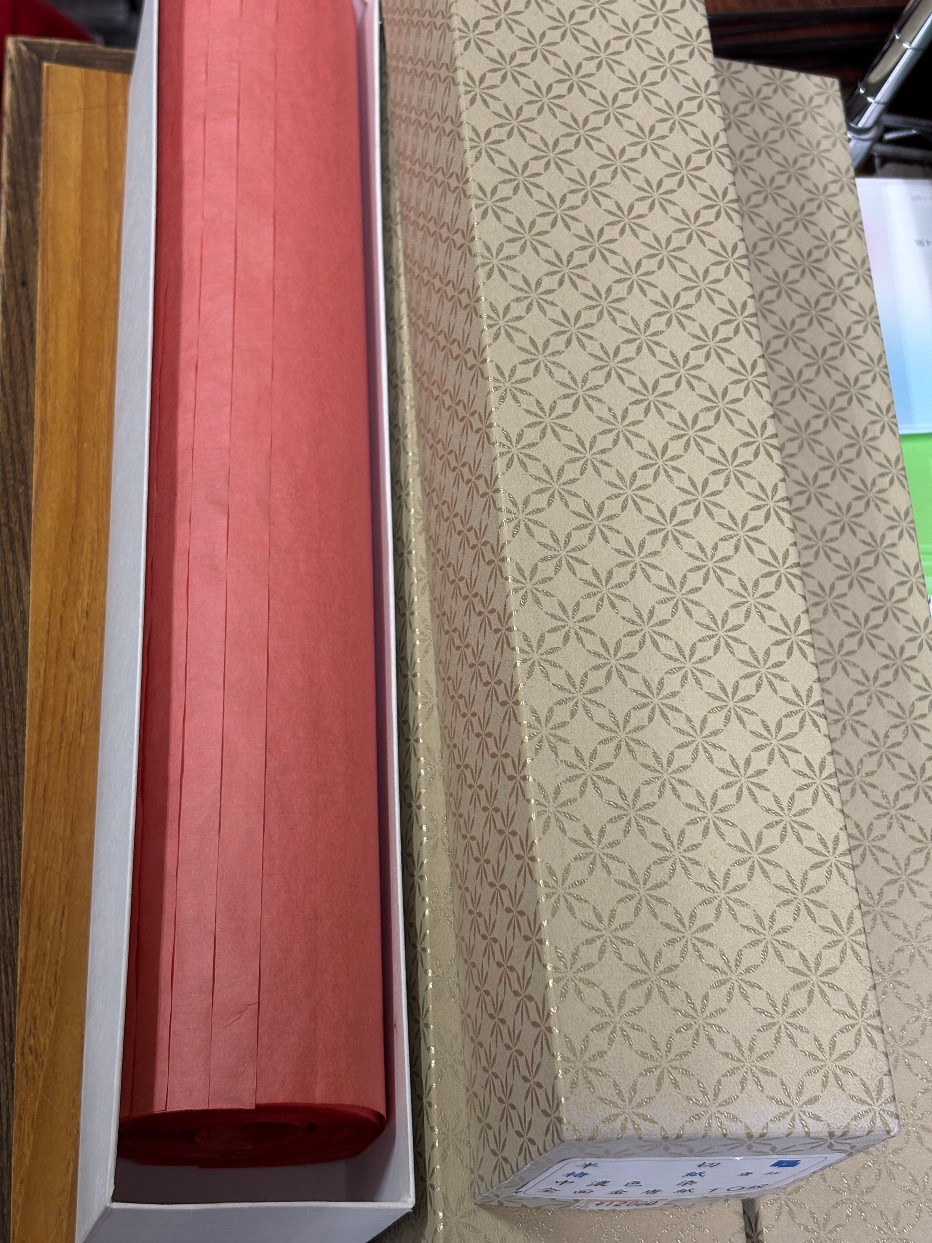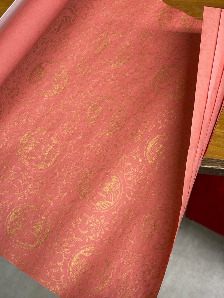 楮紙を濃い目の色で染め上げ、全面に金の金の紋打ちを施した紙になります。