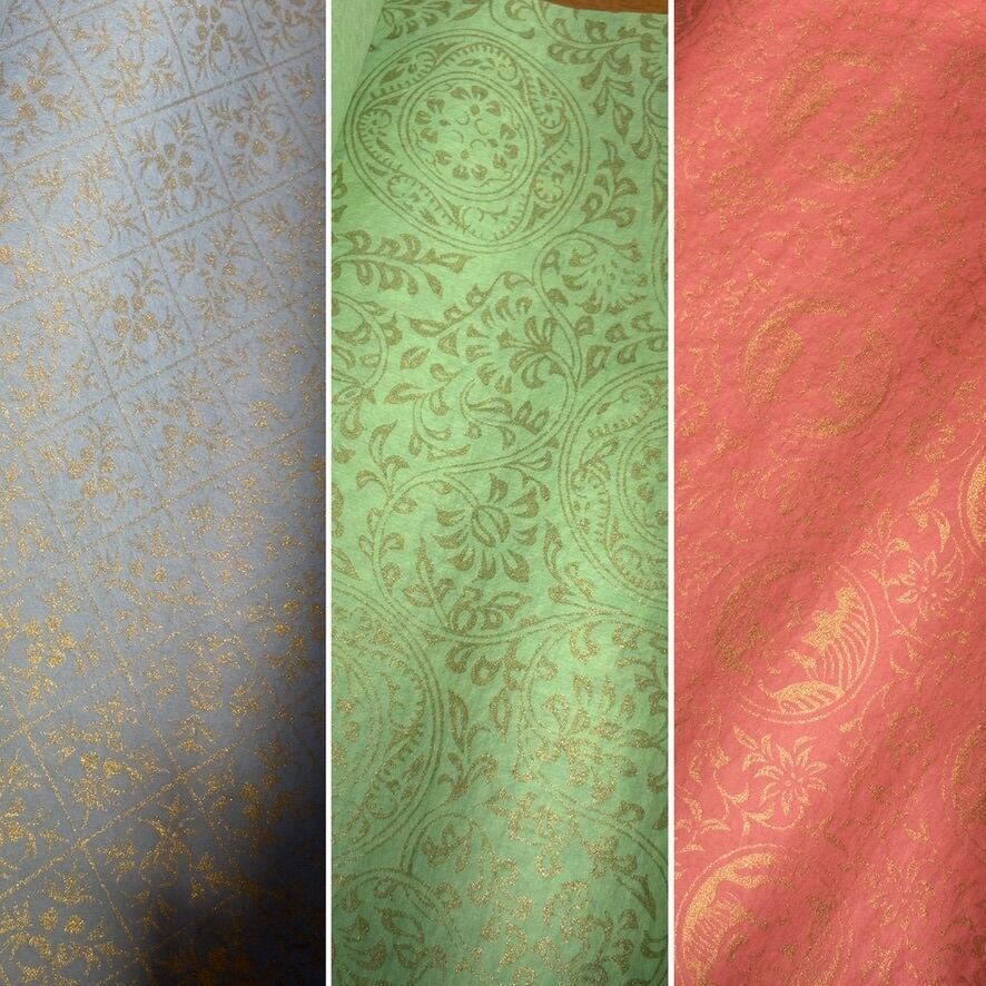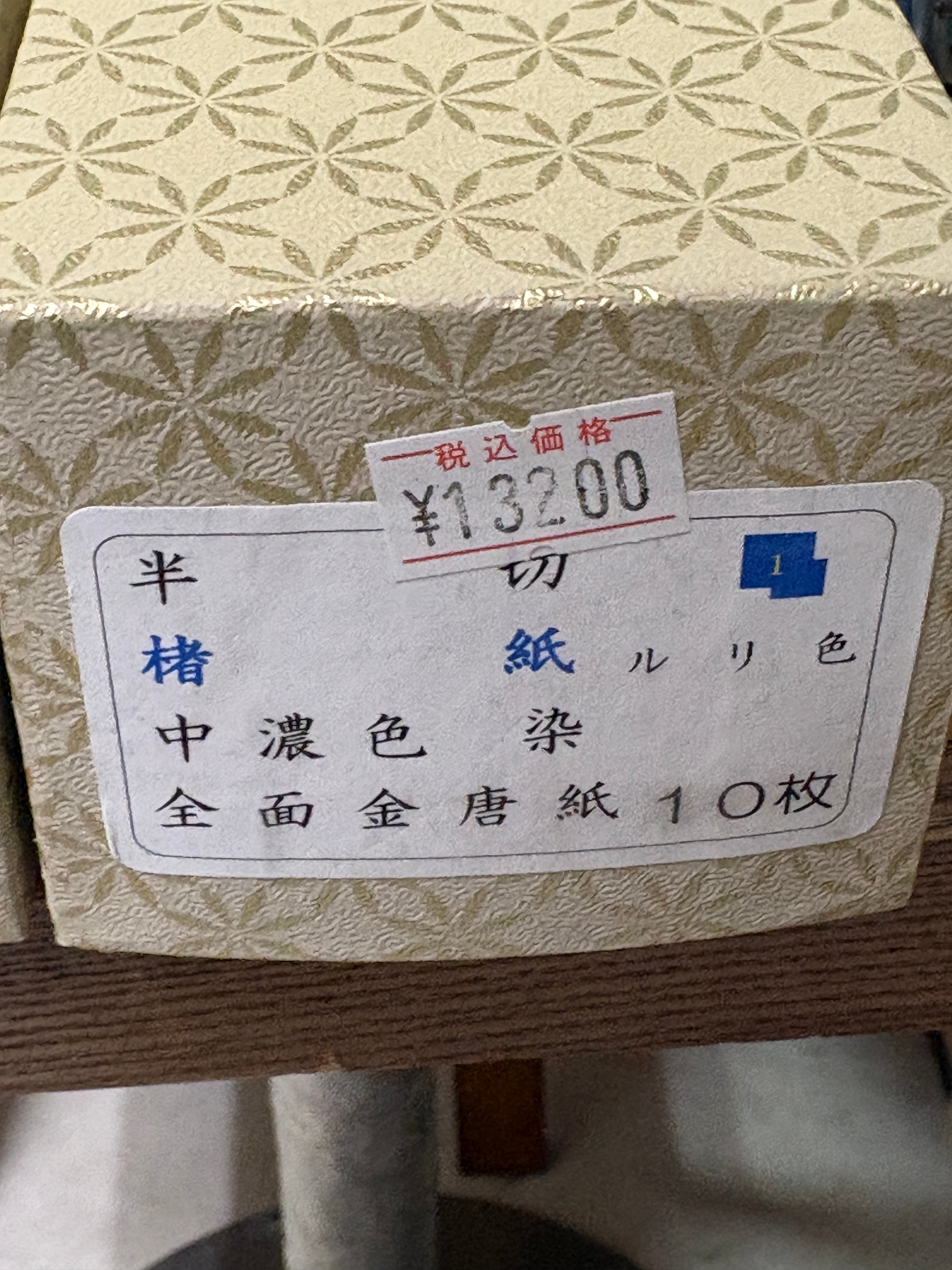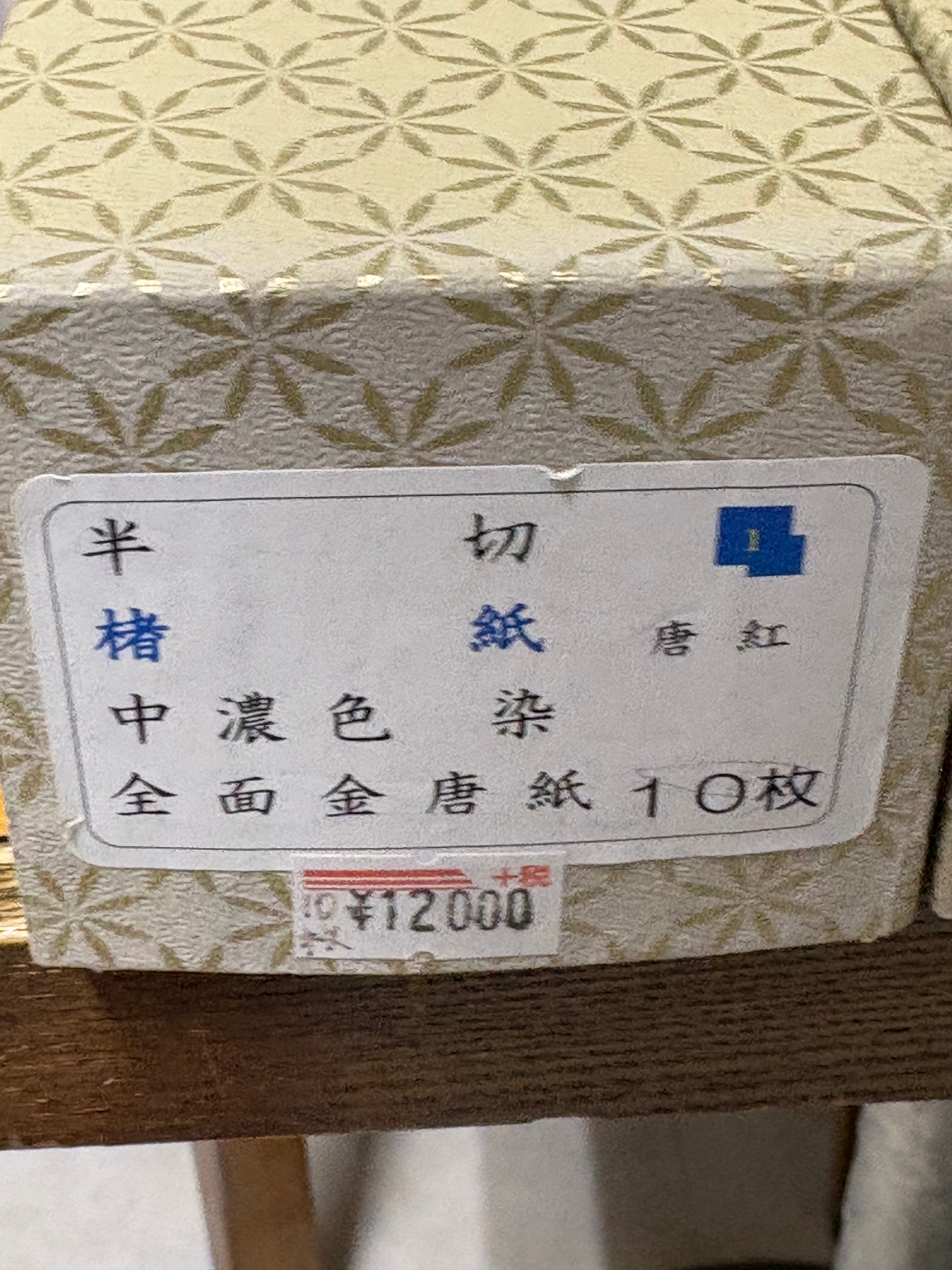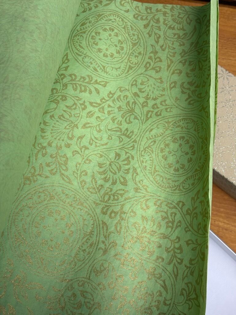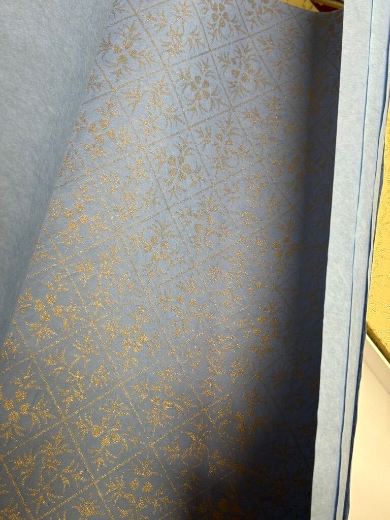 楮紙を濃い目の色で染め上げ、全面に金の金の紋打ちを施した紙になります。