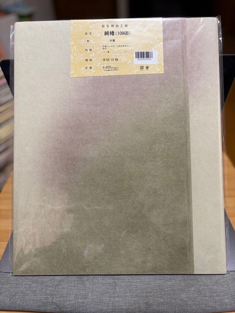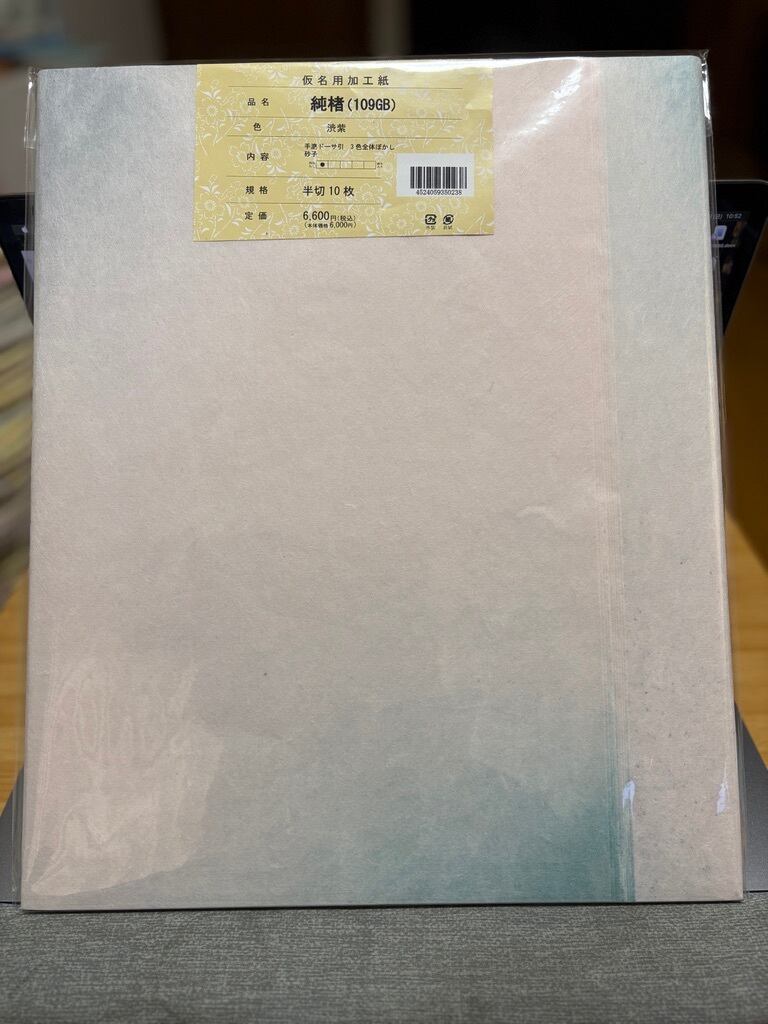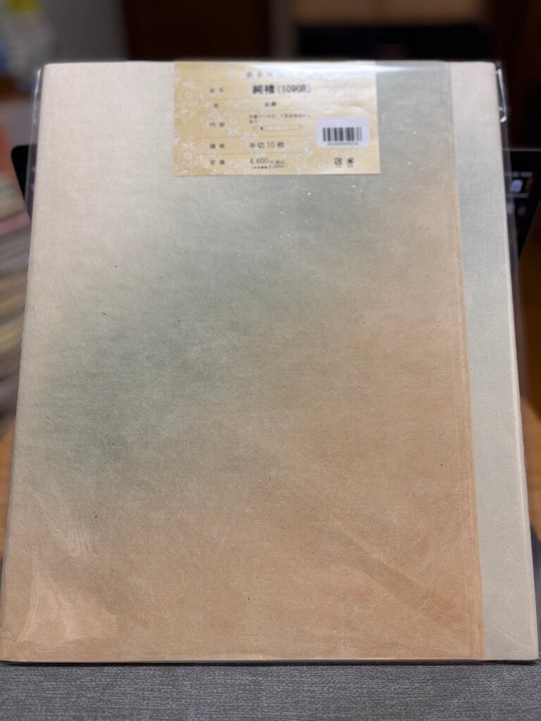 滲みの少ない加工をされた仮名用手漉き料紙の半切サイズ(約35cm×約136cm /書道の全紙の紙の幅を半分にしたサイズであり、最も一般的に使用される書道用紙の一つです)になります。