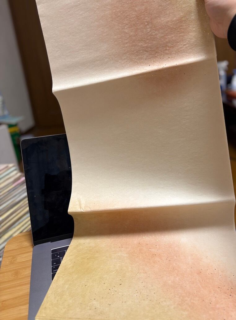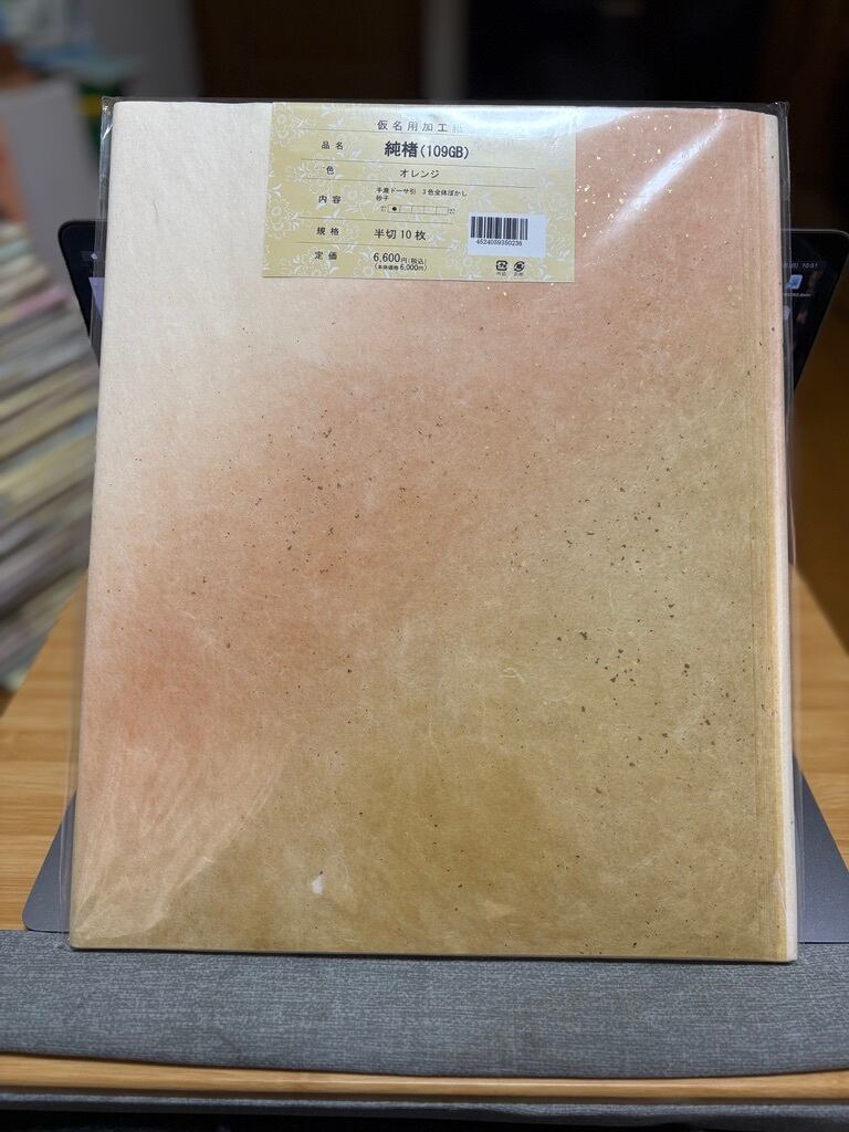 ただでさえ滲みの少ない楮の紙にドーサ引(強めな加工)なので滲みはほぼなく、ベースの色にプラス2色のぼかしが入って砂子も振ってあるそれぞれに特徴的な色合いの料紙になっています。写真で広げたものがオレンジで全部で7色ありますのでお好みのものをお選びください。