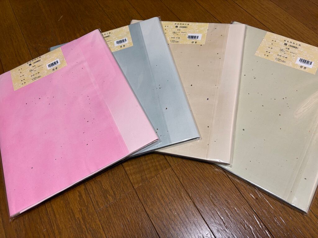 ドーサ引(強めな加工)ですが滲みは少なめ程度で、鮮やかな単色の全体ぼかしに砂子や切箔が大胆に振ってあります。写真は4冊出ていますが、複数の組み合わせではなく単色10枚一冊ですのでお気をつけください。