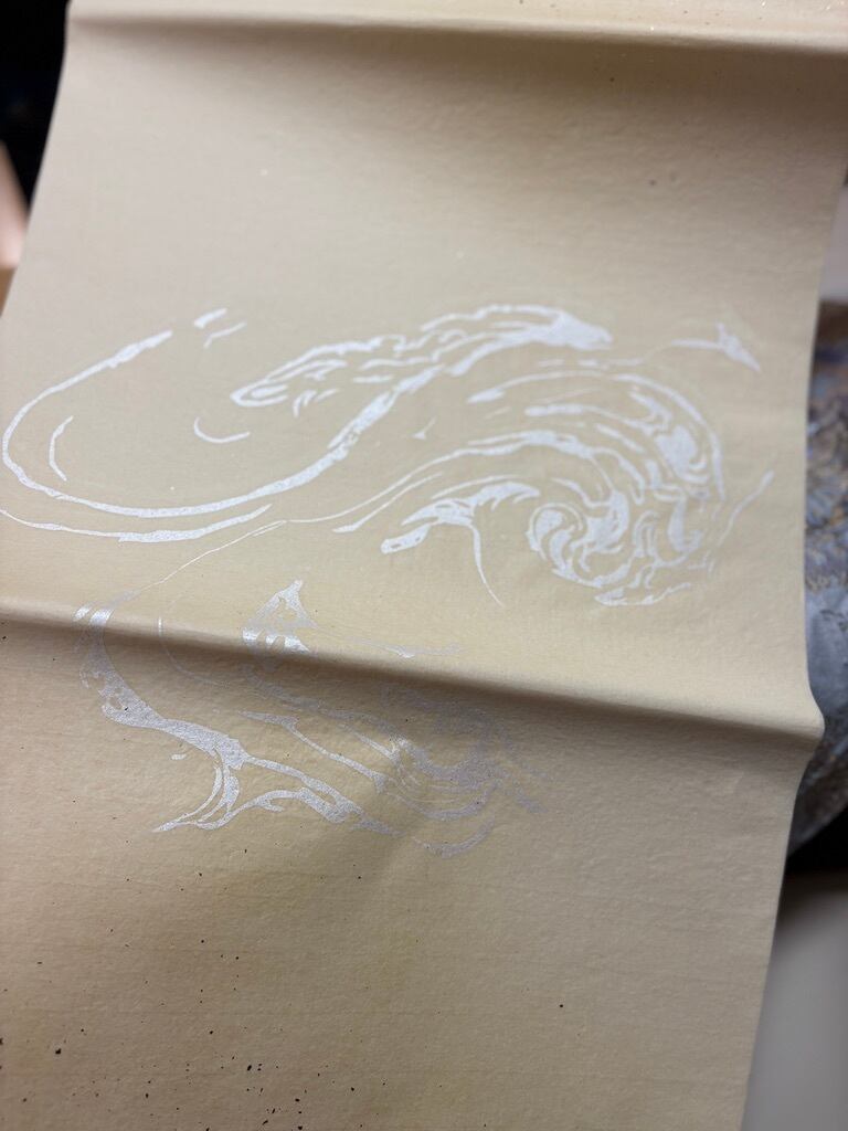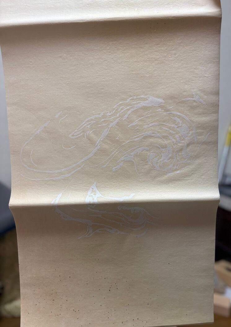 ドーサ引(滲みどめの強めな加工)ですが滲みは少なめ程度で、3色全体ぼかしに砂子が振ってあり、一番の特徴はパール型打という白系で艶のある模様が入っていることです。広げてご覧になりたい方はメッセージにいただければ画像をお送りします。
