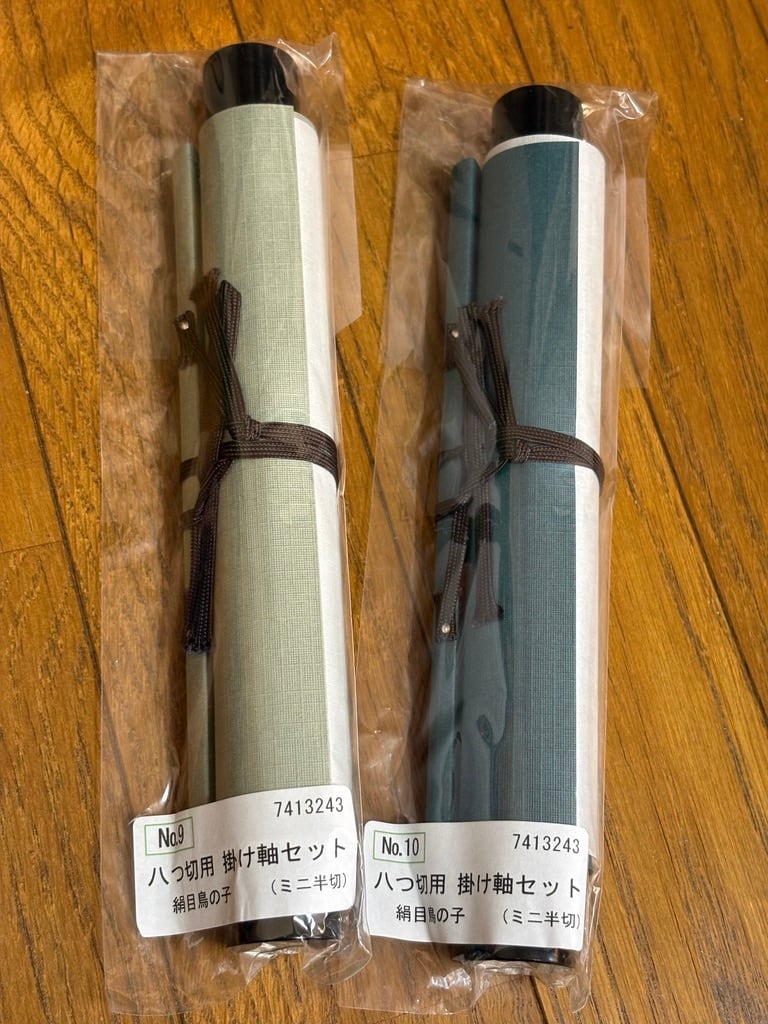 簡易掛け軸セットは、掛け軸の上下部分2枚組になっていて、両面テープがすでに着いているので八つ切り(約17.5cm×68cm)に書いたら、上下にこの掛け軸セットを貼るだけで裏打ちをしなくてもピンと張った掛け軸作品になるというものになります。