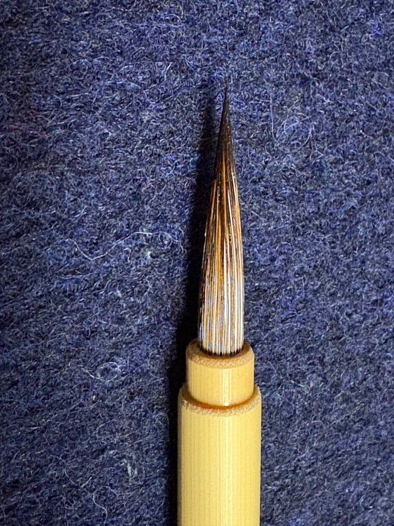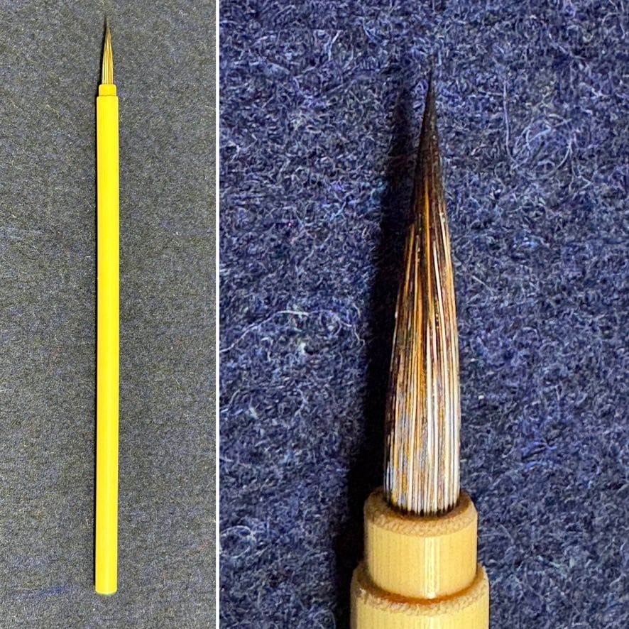 こちらは人気の中筆『白狐』と同じシルバーフォックスの毛を使った小筆で、気持ち穂先のノリがおりやすくなっておりますので、全ておろして使うのがおすすめの小筆になります。