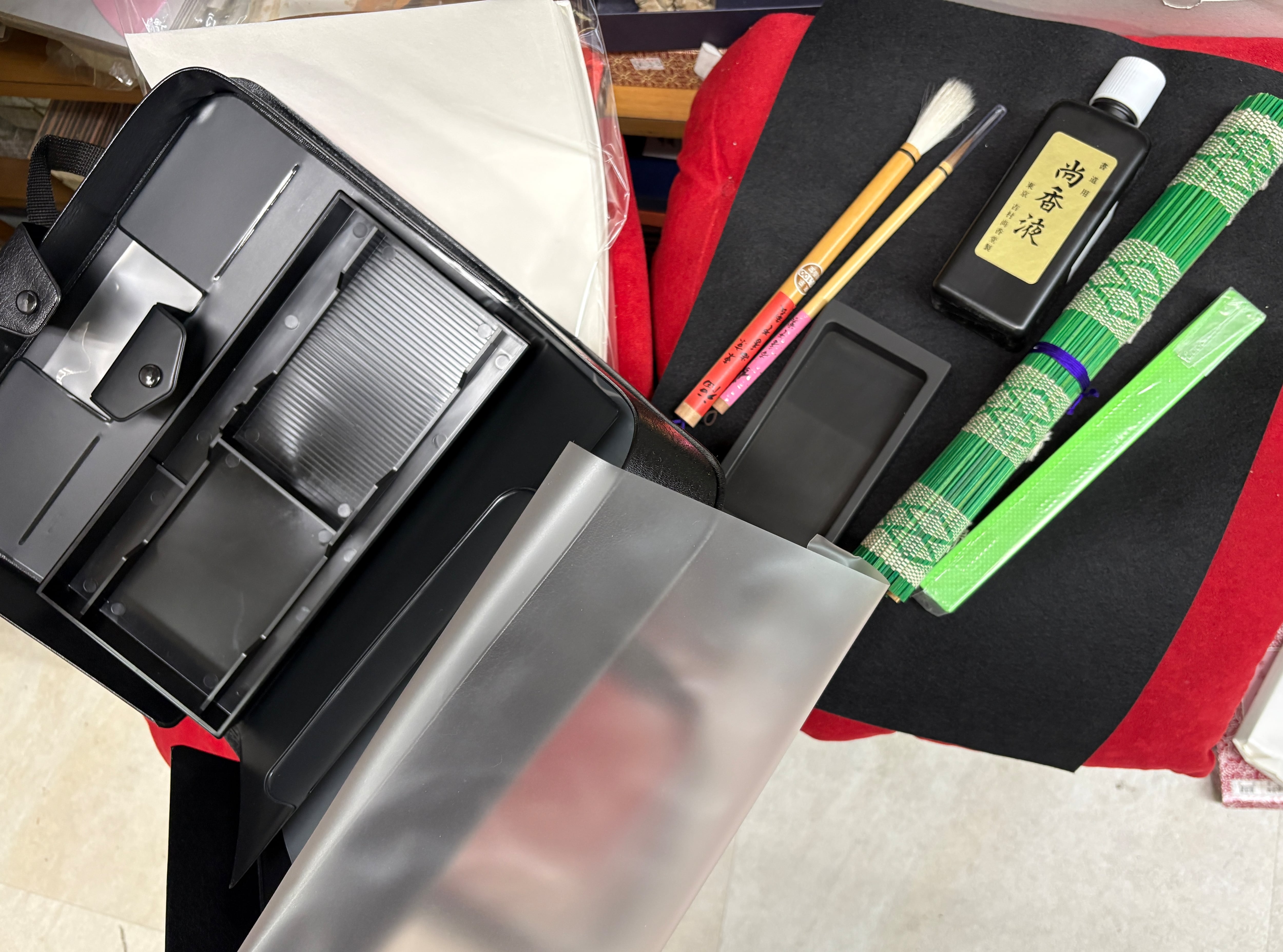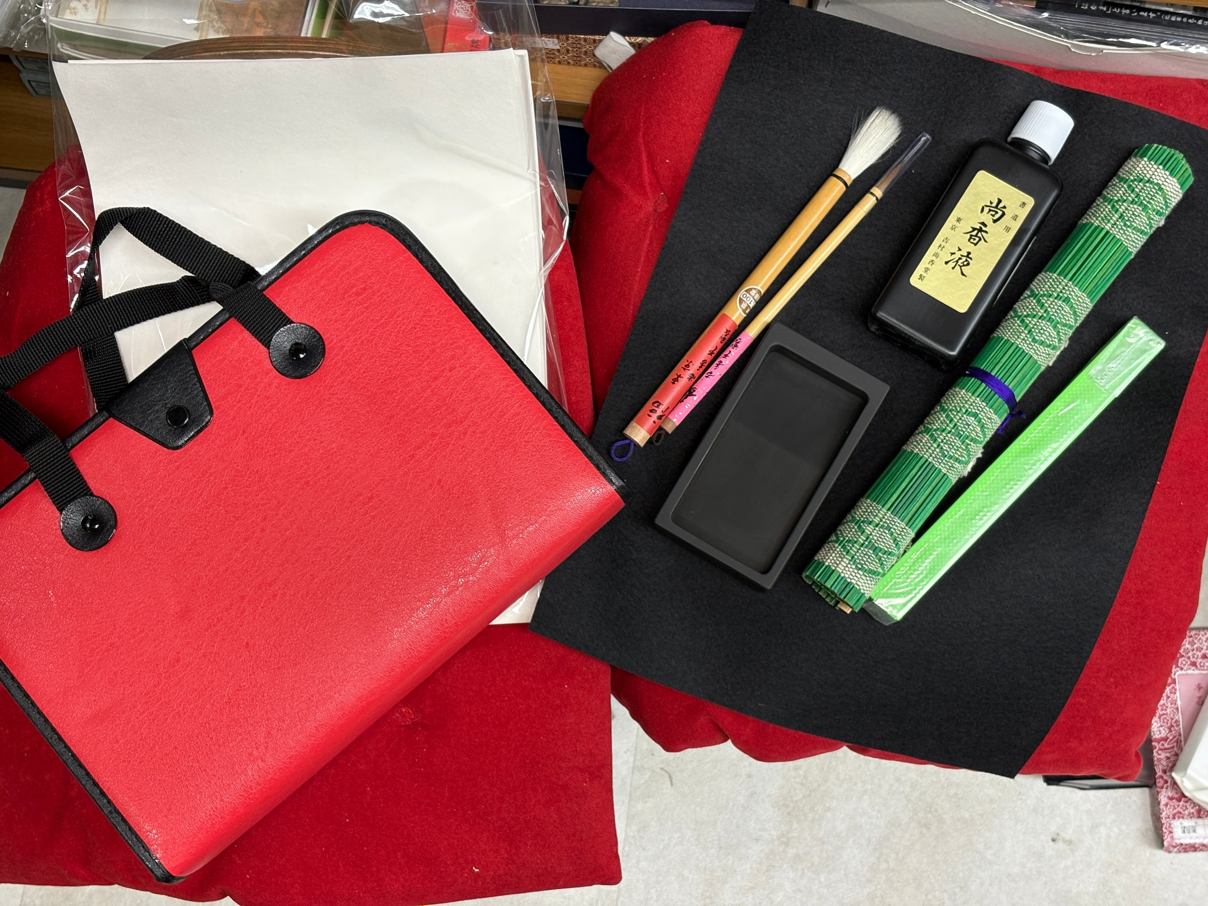 ⑨書道ケース付き赤カバン(昔ながらのハード角形。中には半紙入れもついています)