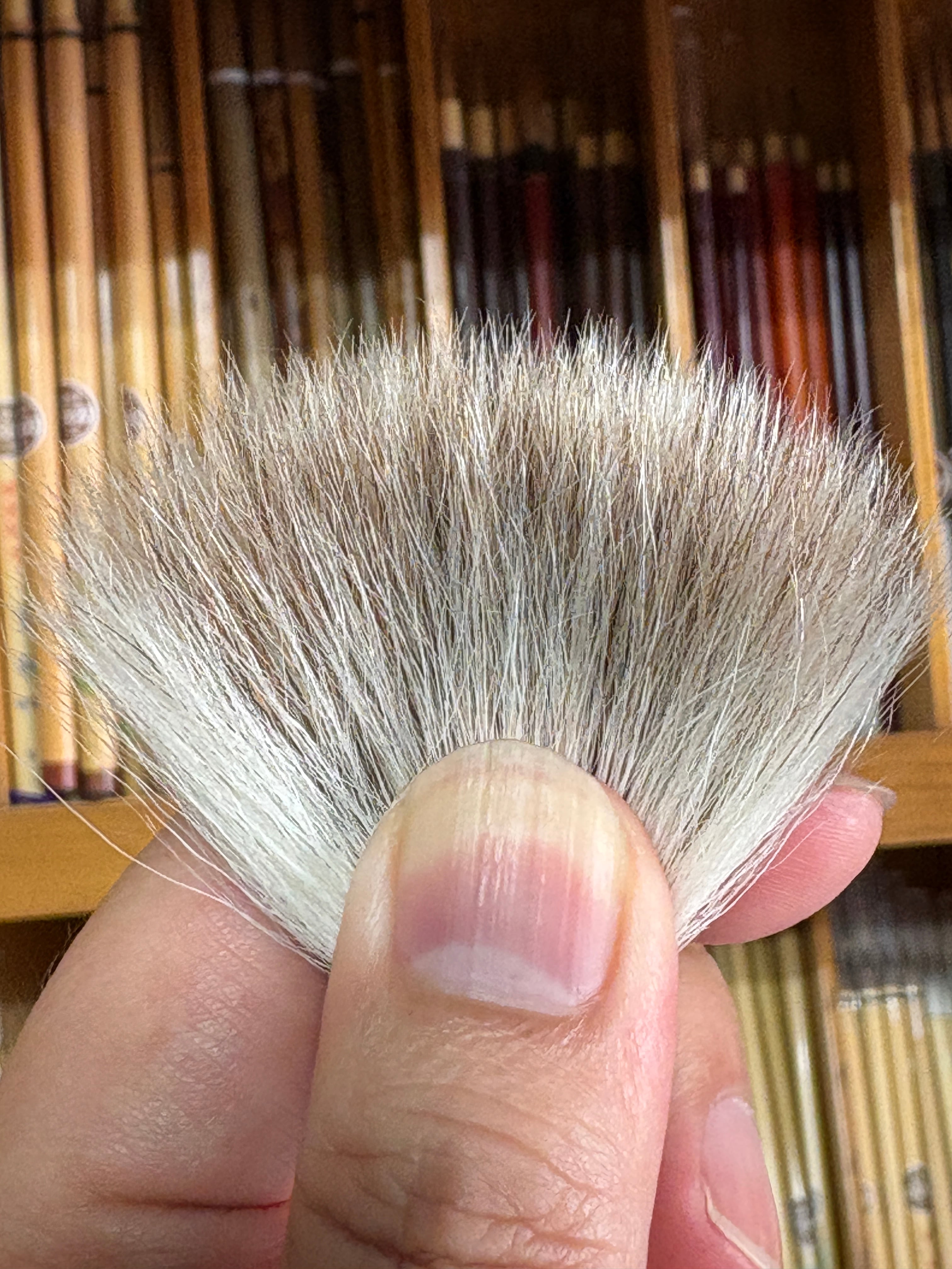 こちらは飯島春敬先生(昭和20年に日本書道美術院を創設し,戦後の書道界の再建と書道普及につくした)が新書芸(漢字仮名交じり文)用に選定してくださった筆で、は穂のサイズが12×45㎜といった短穂の筆。いい羊毛といい馬毛を合わせた兼毛で、馬毛の割合が多めで力のある線が書ける筆になります。