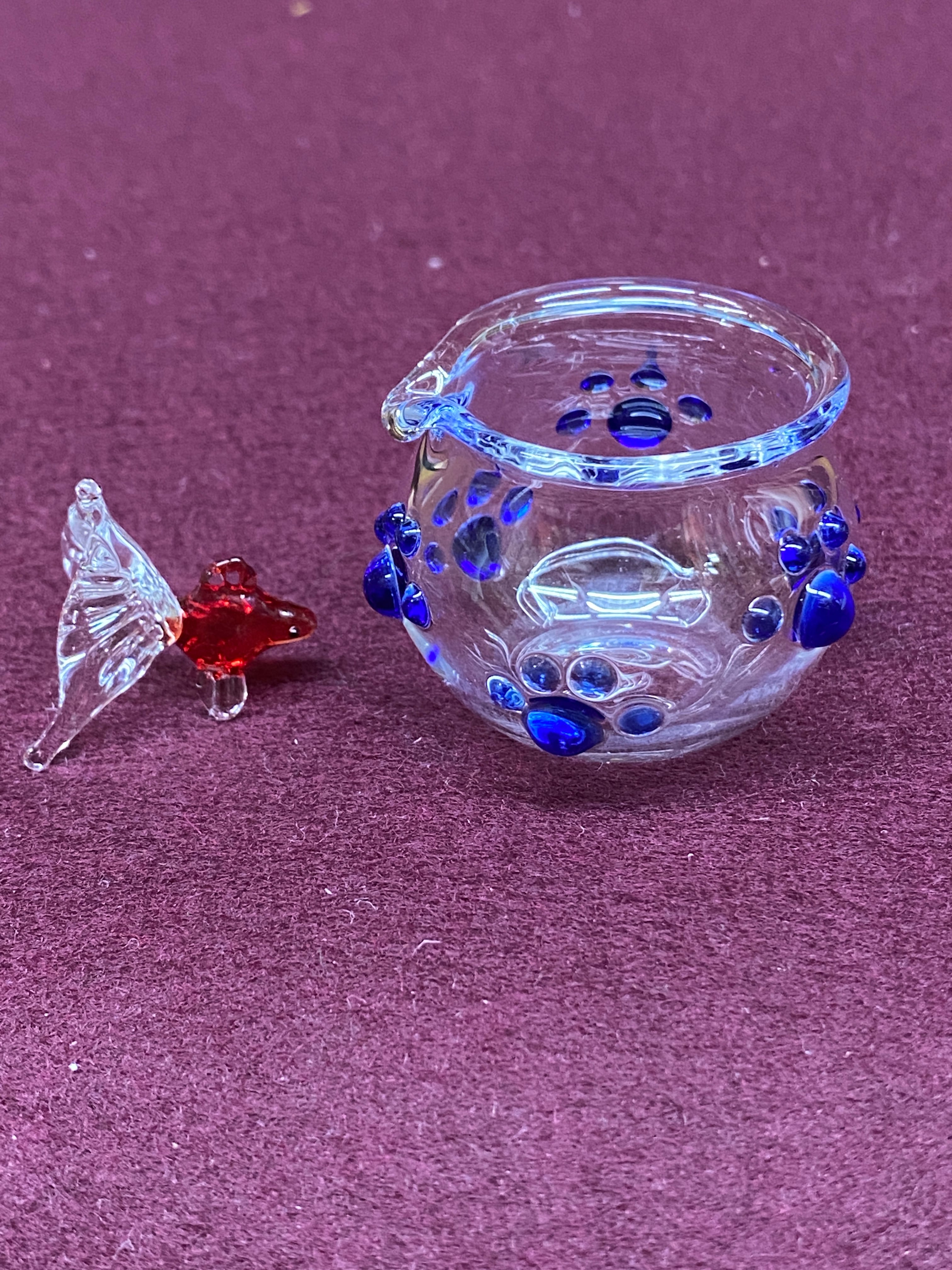 This is a glass water dropper featuring a cat paw print design, with blue paw pads.